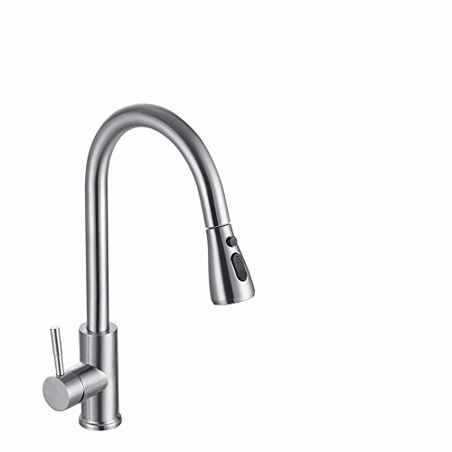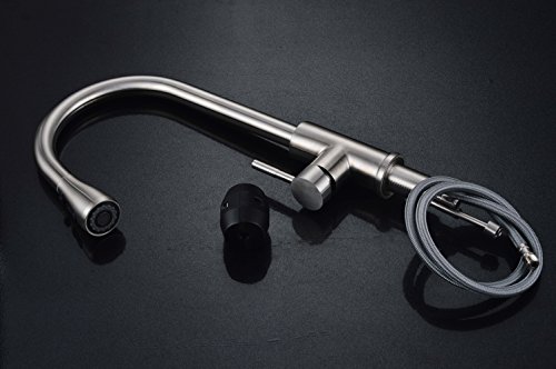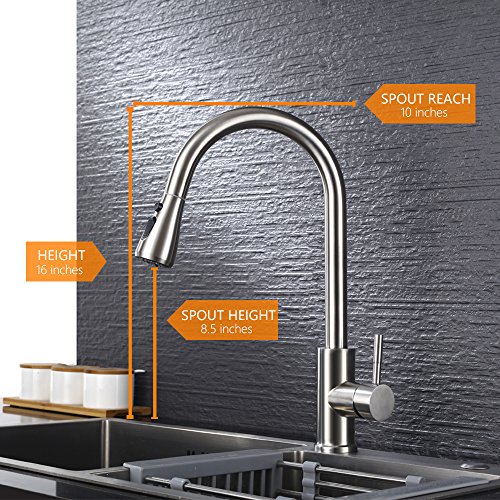 User Friendly - High arc 360 degree swivel spout and 20" flexible spray hose offer more room for pots/pans. Single handle helps you to control water temperature and flow volume easily