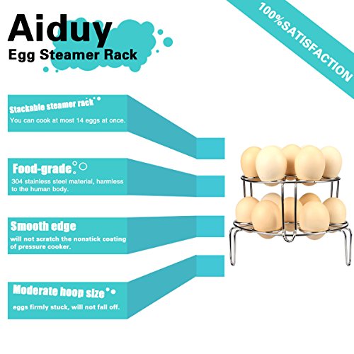 Come in two instant pot egg racks with different heights, 6.9x6.9x2.17 inches and 6.1x6.1x2.7 inches, 7 egg slots in each steam rack, the instant pot steamer rack is stackable so it allow you to cook 14 eggs in a few minutes at the same time.