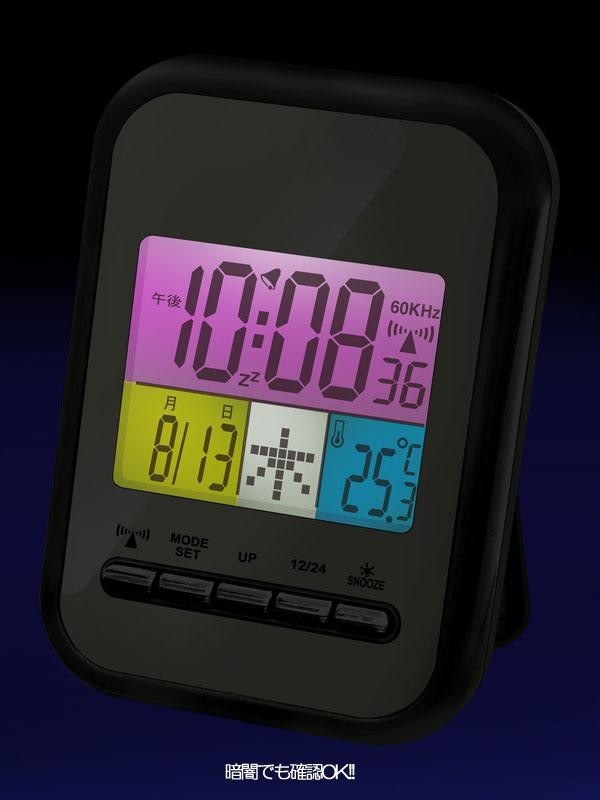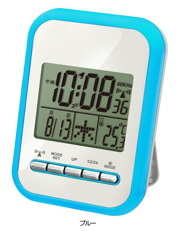| 仕様 | 電源:単4電池(テスト電池)×3個 自動電波受信(40kHz/60kHz自動選局) 日付、曜日、温度表示 10種類のネイチャーサウンドアラーム 3段階のアラーム音量選択 スヌーズ機能 画面バックライト 開閉式スタンド |