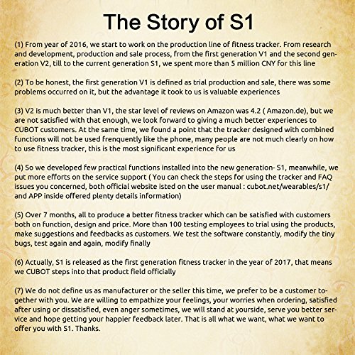 ★【Fully updating, more intelligent】 (1) Raise your hand to brighten the screen, Cubot S1 screen automatically give light, you check the time. (2) Incoming call: When the phone has calls or messages, Cubot S1 will vibrate, you won't miss any call. (3) Sedentary reminder: You'd better set the sedentary reminder for the busy work. When the band vibrates, it's time for your to rest. (4) Drinking Reminder: In the APP, you could select several time period to remind you drink water,very intimate.