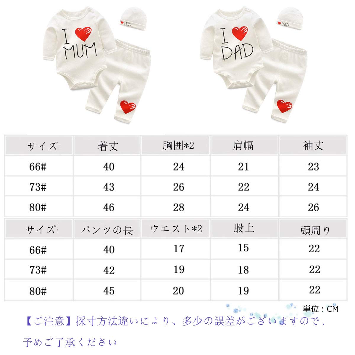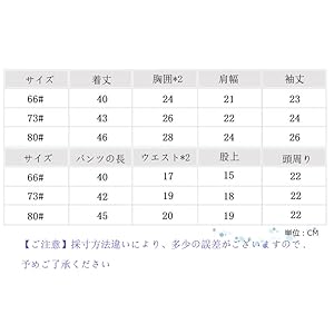 1 サイズ:●【66#】着丈:40cm チェスト:24cm パンツの長:40cm 頭周り22cm●【73#】着丈:43cm チェスト:26cm パンツの長:42cm 頭周り22cm●【80#】着丈:46cm チェスト:28cm パンツの長:45cm 頭周り22cm