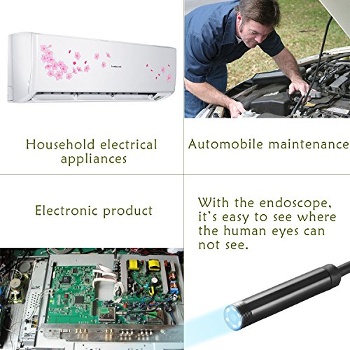- Featuring 5.0M cable, Waterproof IP67, 8 adjustable LED light on the camera:This endoscope suits for various types of environment, such as low-light or dark area,damp or wet area,testing tools,exhaust pipes,machinery and equipment,engines,automobiles,ships,parts assembly,construction site,wind turbine,aircraft inspection,etc. Perfect for inspection work.