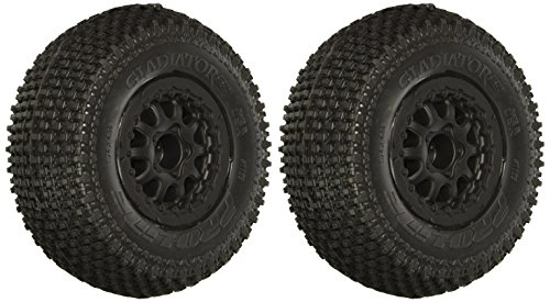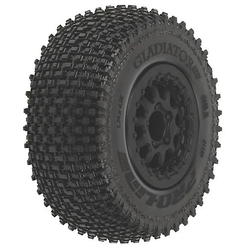 This is pro-line's Gladiator SC 2.2"/3.0" tires mounted on renegade black wheels (2) for Slash rear, Slash 4x4 front or rear and Blitz front or rear. The Gladiator tread is an icon in the world of RC because of its unmatched traction and durability on a variety of surfaces. For over a decade, gladiator tires have been tearing up bash and race spots around the world. Now, Pro-Line racing is bringing the Gladiator tread to your short course truck so you can dominate the terrain!.Feature