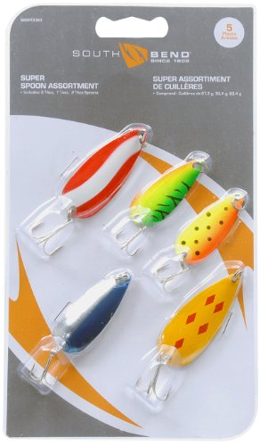 -. Binding : Sports -. Brand : South Bend -. Color : 5-pack -. EAN : 0039364131556 -. Feature : Includes: two 3/8 oz., one 1/4 oz., two 1/5 oz. / Great addition to any tackle box / Makes a great gift -. Label : South Bend Sporting Goods -. Manufacturer : South Bend Sporting Goods -. Model : SBSPOON3 -. MPN : 118488 -. PackageQuantity : 1 -. PartNumber : 118488 -. ProductGroup : Sports -. ProductTypeName : SPORTING_GOODS -. Publisher : South Bend Sporting Goods -. Size : 5-Pack -. Studio : South Bend Sporting Goods -. Title : South Bend Super Spoon Assortment, 5-Pack -. UPC : 039364131556