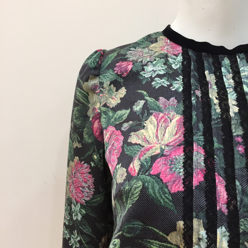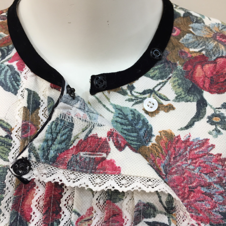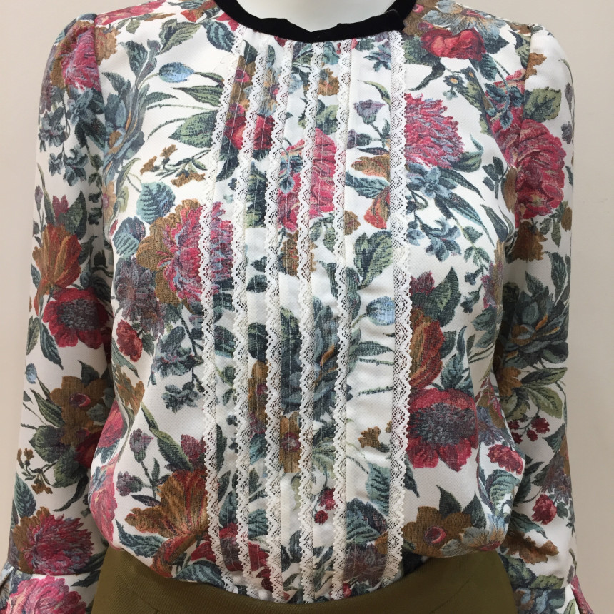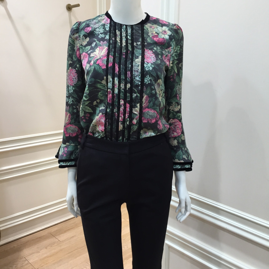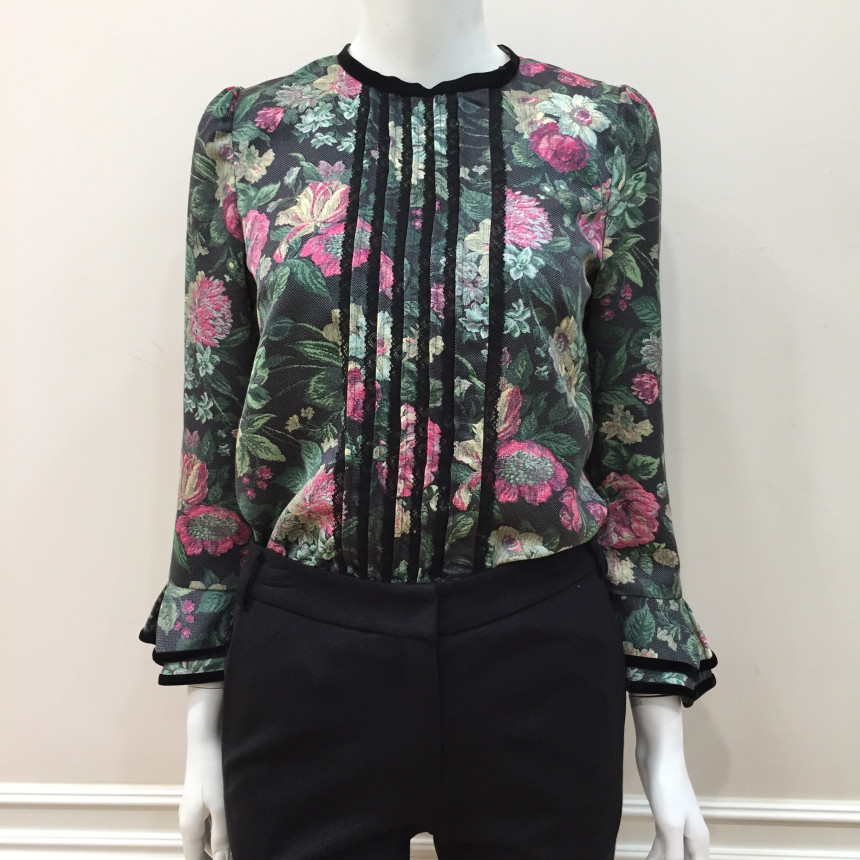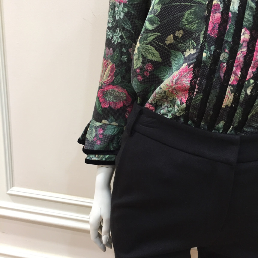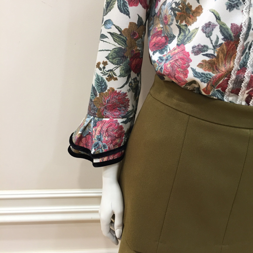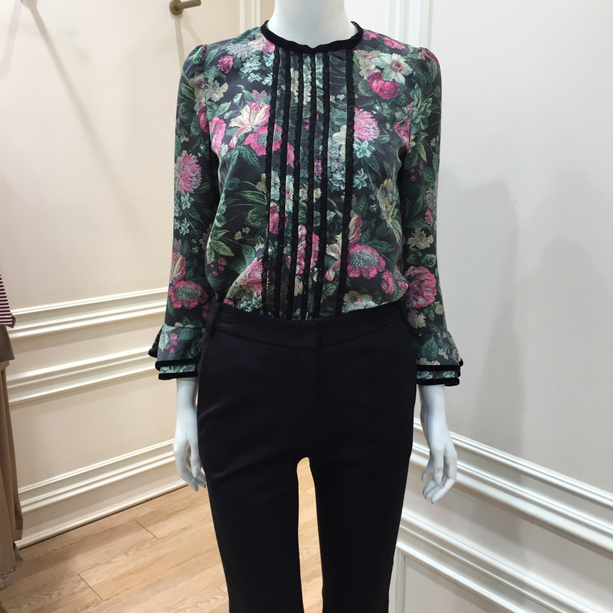 네크라인과 소매프릴에 벨벳테이프로 포인트를 준 프린트 블라우스입니다.