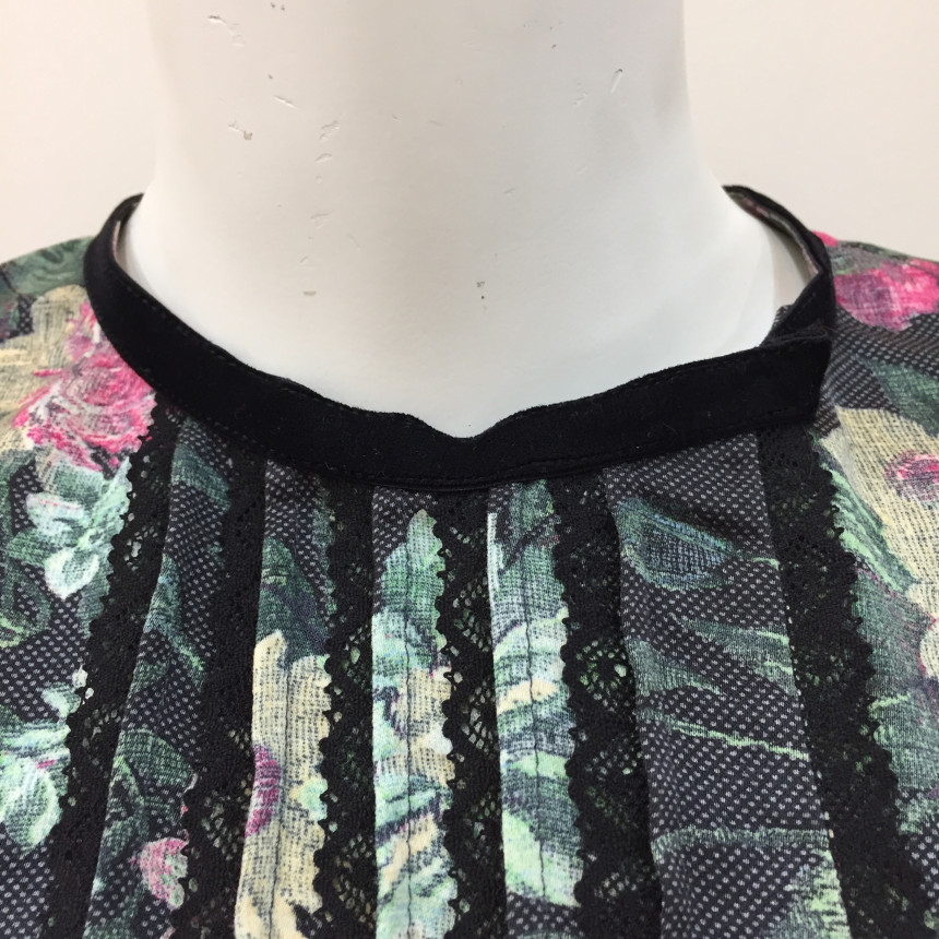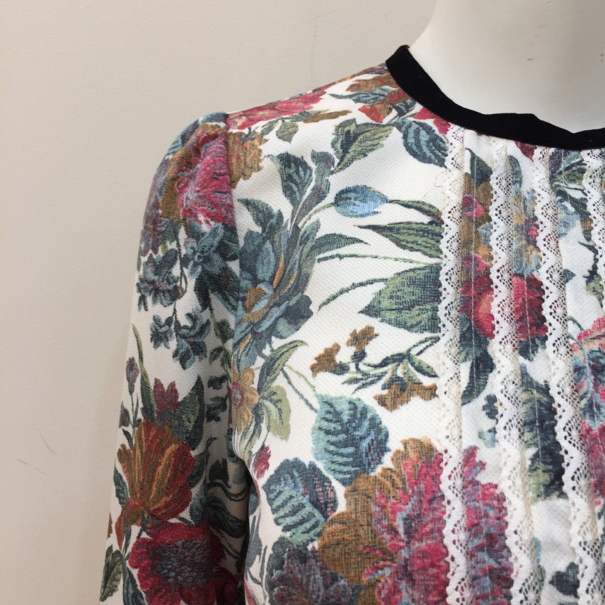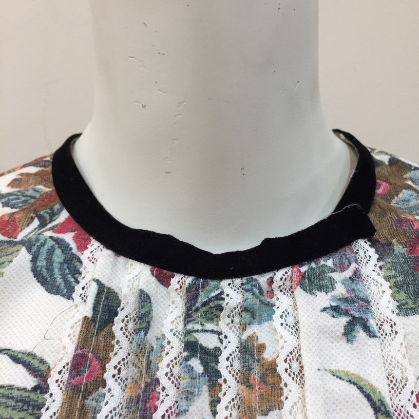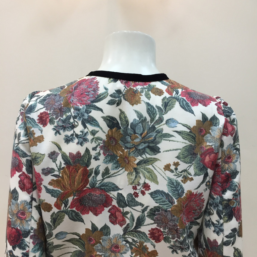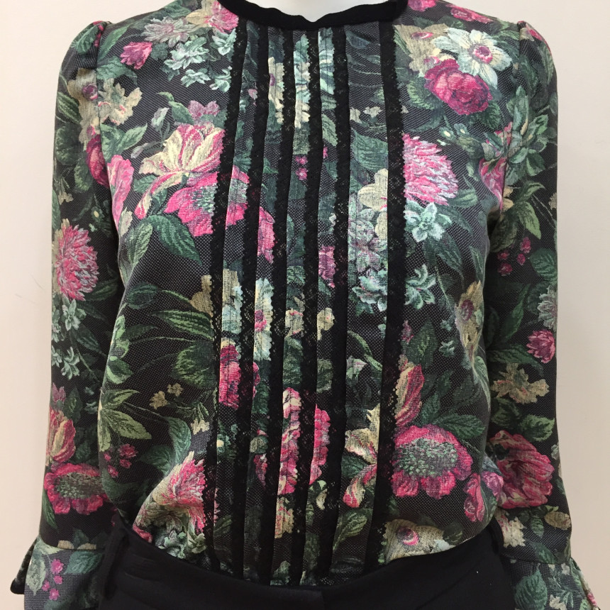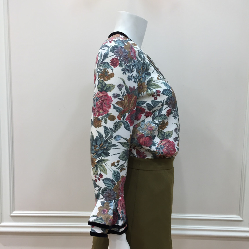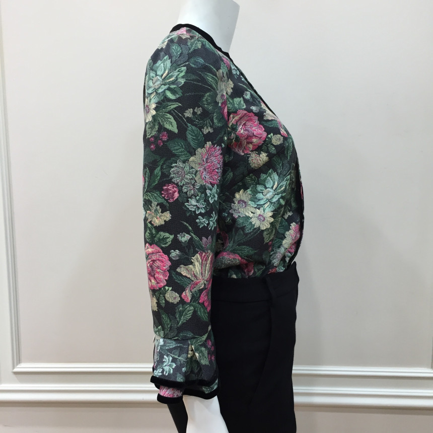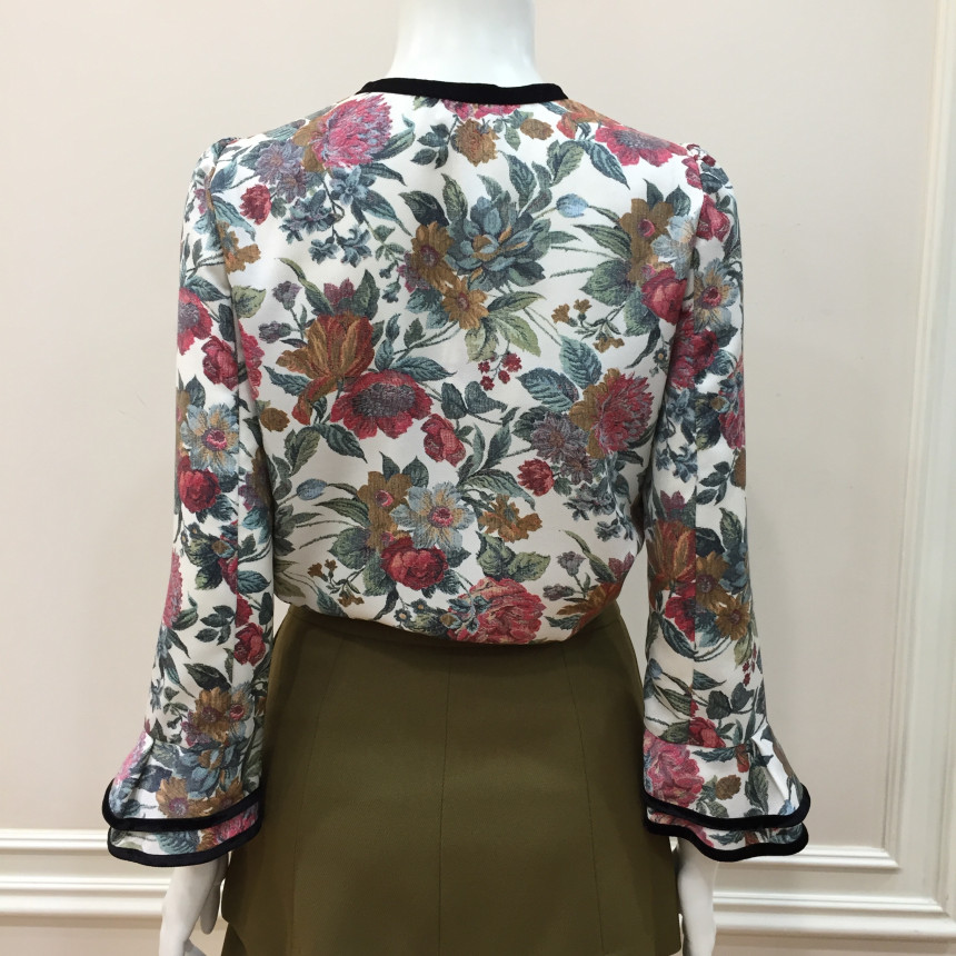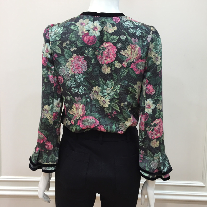 네크라인과 소매프릴에 벨벳테이프로 포인트를 준 프린트 블라우스입니다.