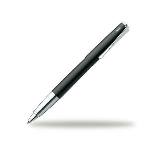 Tintenroller des Markenherstellers Lamy, der Lamy studio (Modell 367). Der Edelstahlkorpus schimmert im mattschwarzen Lack-Finish. Das Griffstück und der Clip sind hochglänzend verchromt. Als besonderer Akzent ist der Clip zudem propellerförmig verdreht.