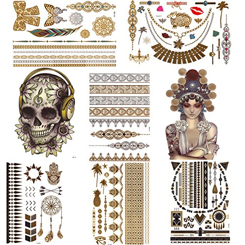 Metallic Temporary Tattoos Flash Tattoos 8 Sheets Premium Metallic Henna Tattoos -Skull, Flowers, Bracelets,Opera actor,Wrist and Arm Bands 8 sheets set