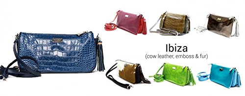Product Description With its 7 compartments, our little IBIZA is called "space wonder" by our customers and has an inbuilt wallet. It is built like a prism, unfolding wide towards the bottom while remaining slim on top so it won't appear "bulky" when fully "loaded". Upon opening the top zipper, you will have access to the two bigger compartments that unfold towards the bottom. 2 more compartments with a triple cardholder on each side are also accessible. The next compartment that is "double secured" through another zipper holds the money and has another small zip pocket for your valuables such as memory stick, jewelry, etc. Furthermore the IBIZA has zip pocket outside at the back. The IBIZA comes with a detachable long cross body strap that can be converted into a wrist strap. You can also wear it without strap as clutch or purse, keeping it in your bigger bag. The lining can vary in color. The IBIZA is available in cow leather, cow leather emboss and stunning special furs. 0