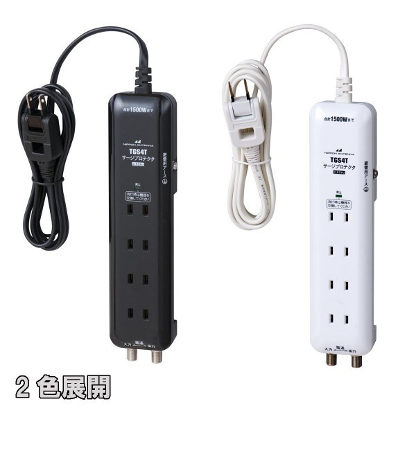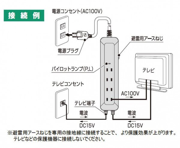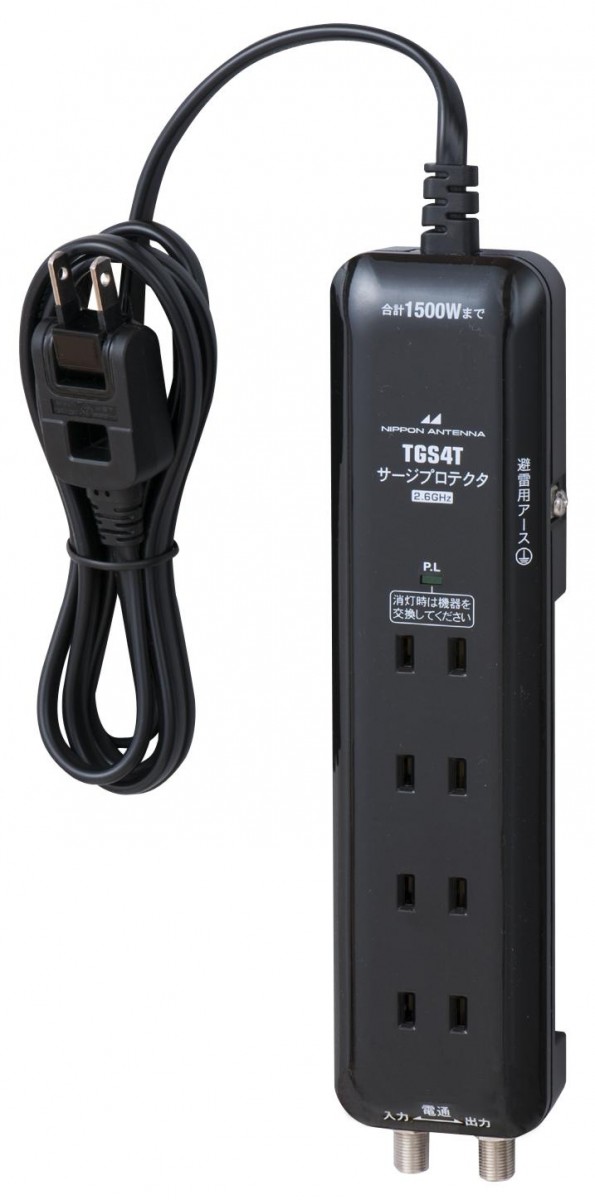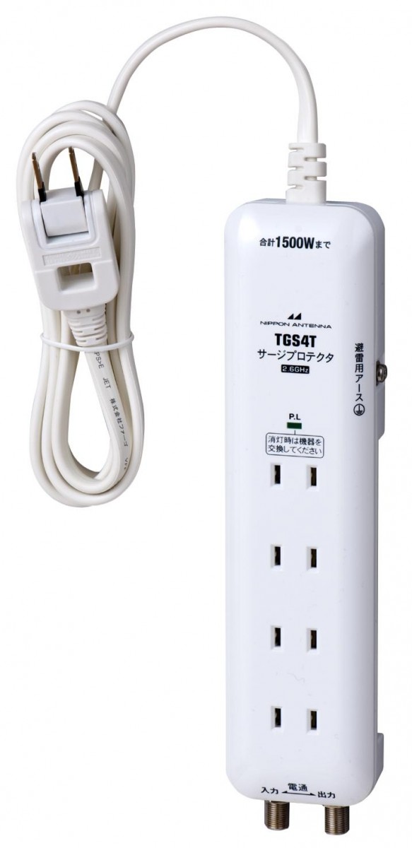 | 仕様 | 電源コンセント4口タイプ 2602MHz対応 RoHS指令対応 スイングプラグ(180度) 定格:AC125V 15A 許容サージ電圧(kV): ±15(1.2/50μs) 許容サージ電流(kA): ±5(8/20μs) 雷防護方法:バイパスアレスタ法 パイロットランプ:点灯(保護)/消灯(無保護) アース端子:M4ねじ AC入力端子:ACプラグ(1.5m) AC出力端子:2極(4口) TV端子:F型 TV端子間 電流通過:最大DC15V/0.5A 使用温度範囲:-10~+40 |