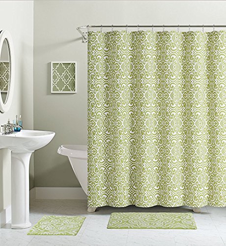 Green White Damask Cotton Fabric Shower Curtain