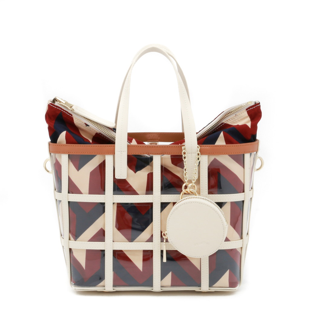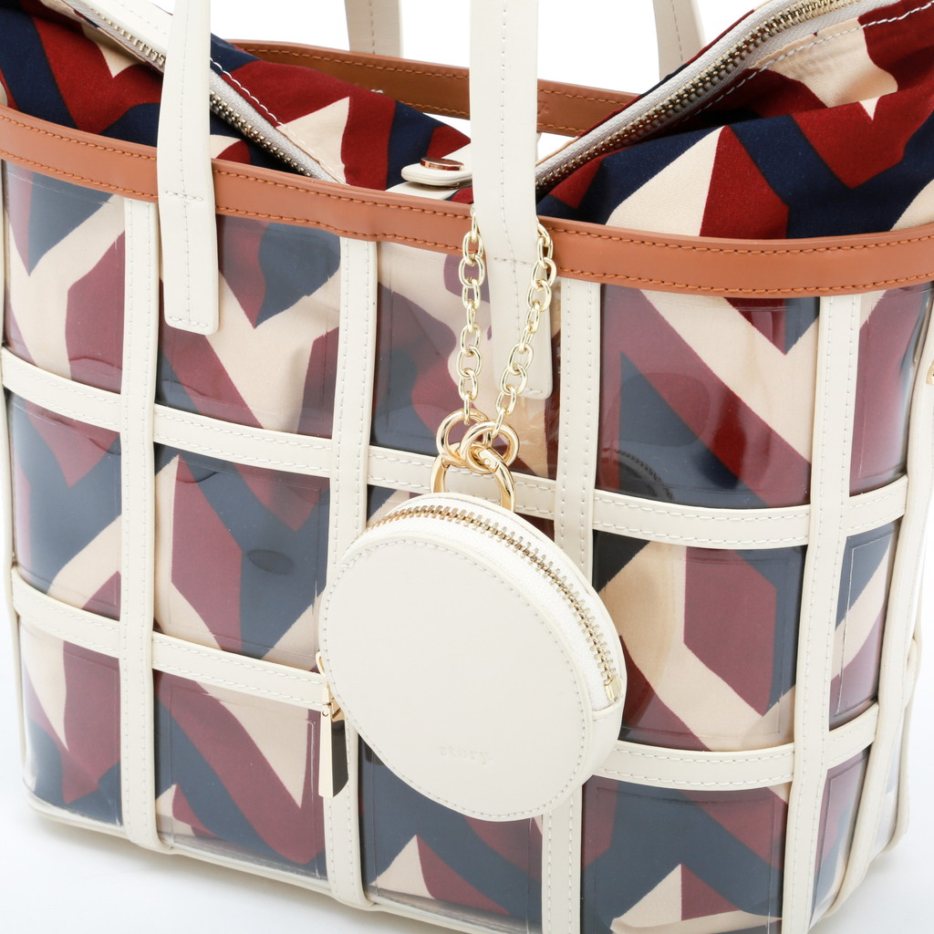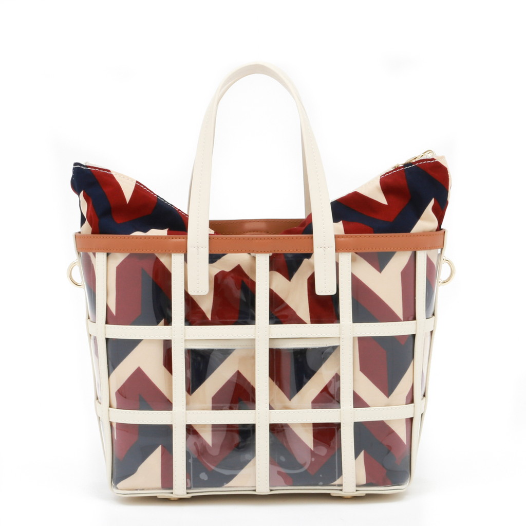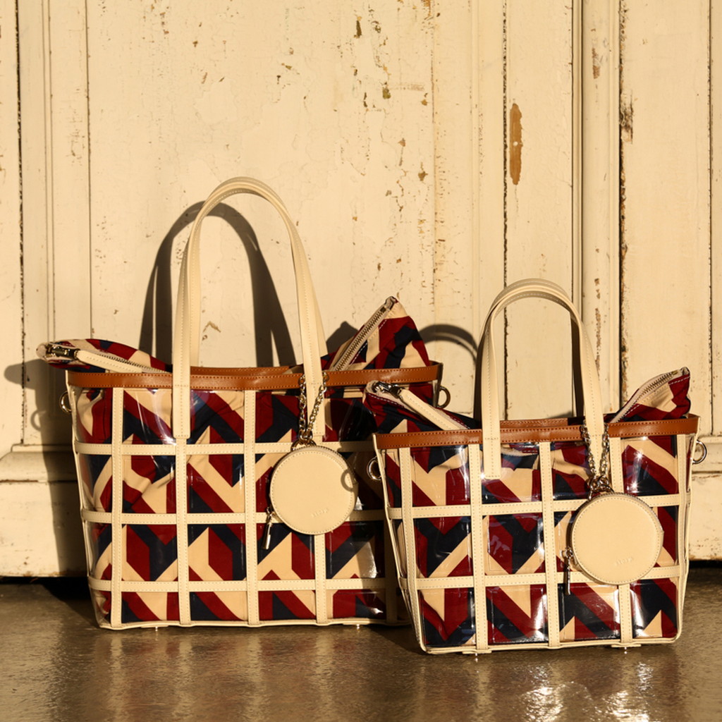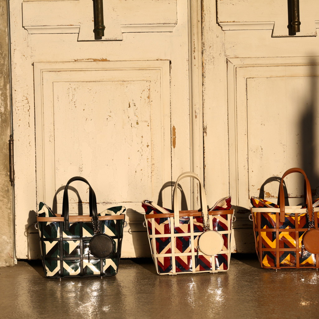 クリア素材にレザーテープを格子状に重ねたユニークなビニールバッグ。外側のチェックとインナーのレトロなジオメトリック柄とのパターンonパターンは、大胆ながらも上品でグラフィカルな仕上がり。インポーチは無地のプレーンなデザインとリバーシブル仕様になっているため、シーンや装いに合わせてセレクトすることが出来ます。
