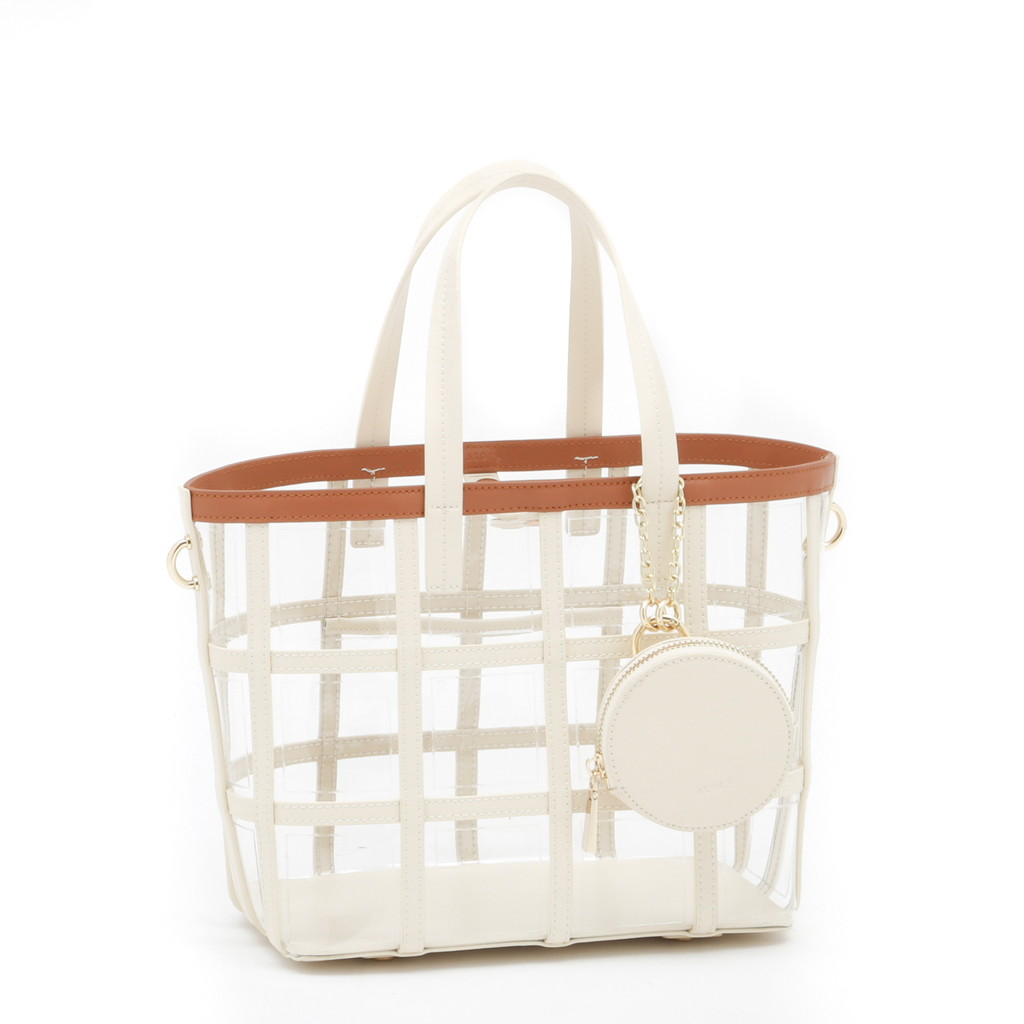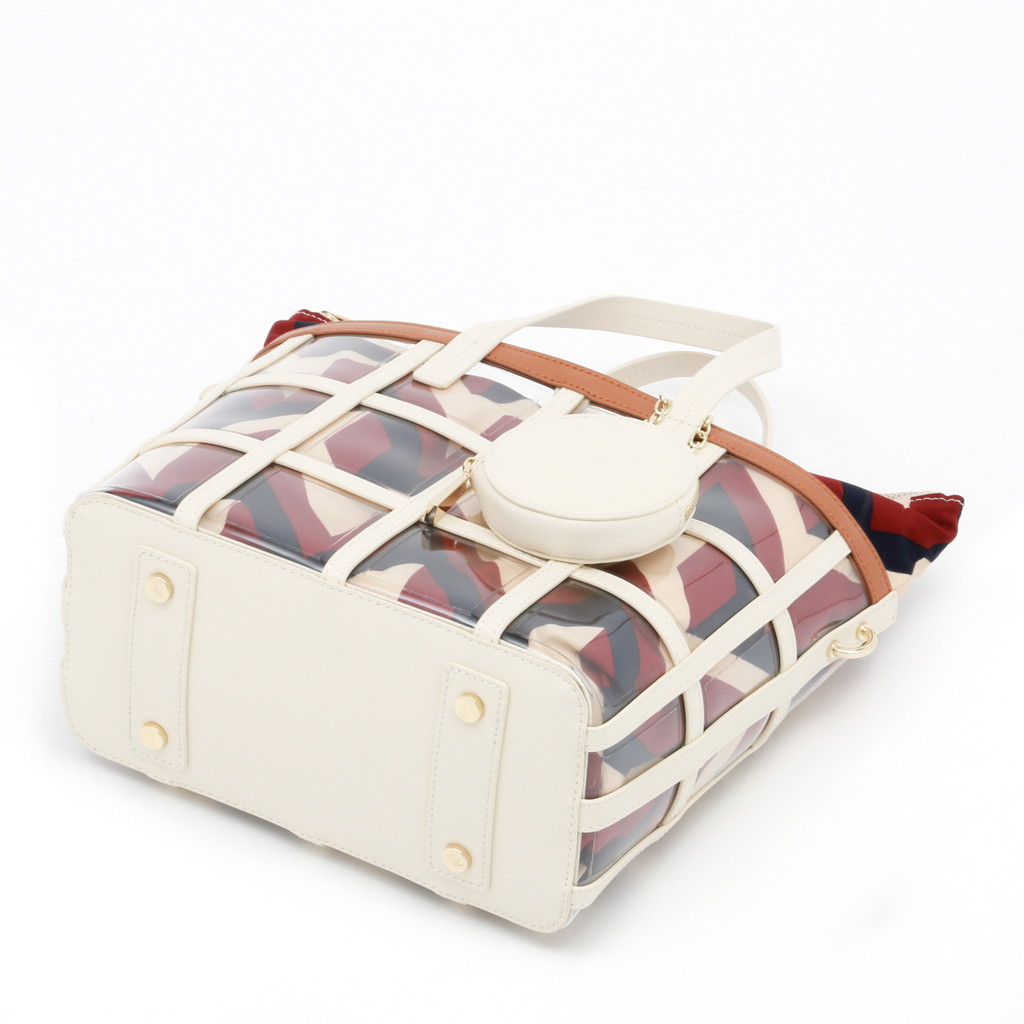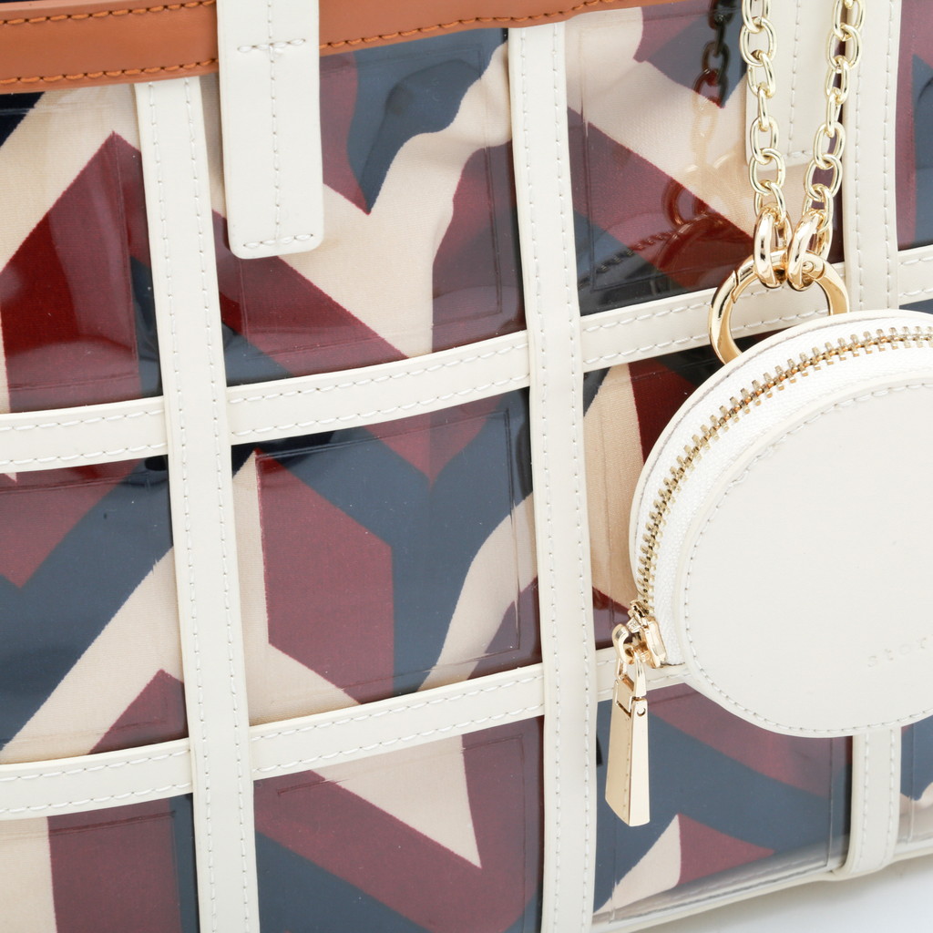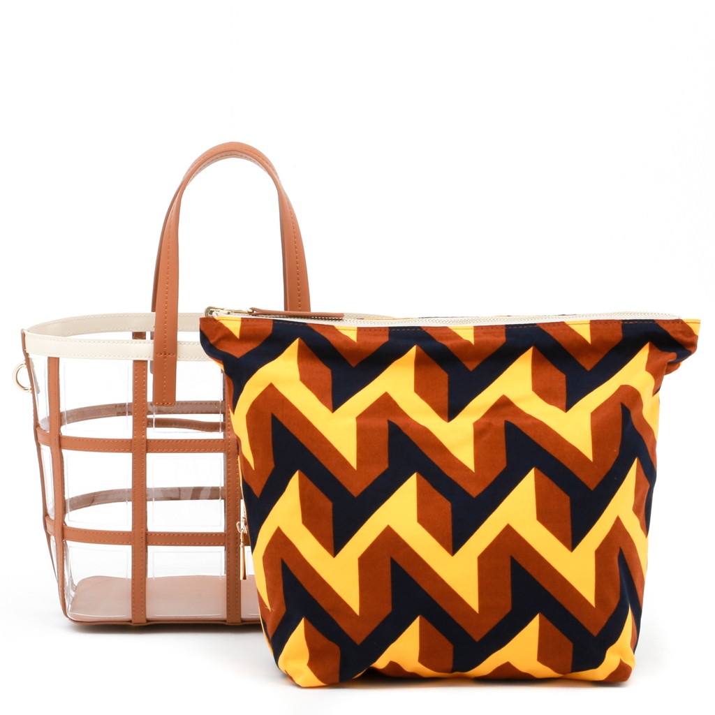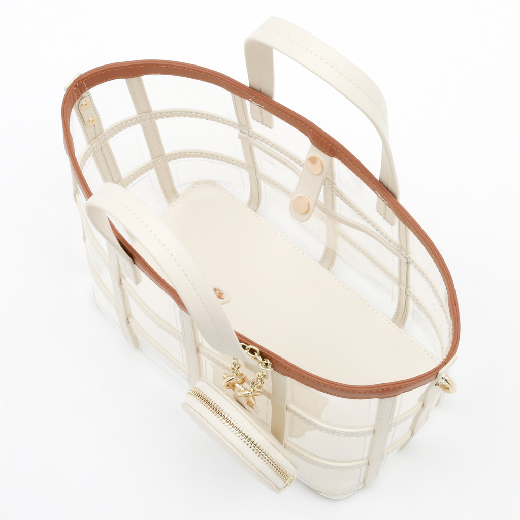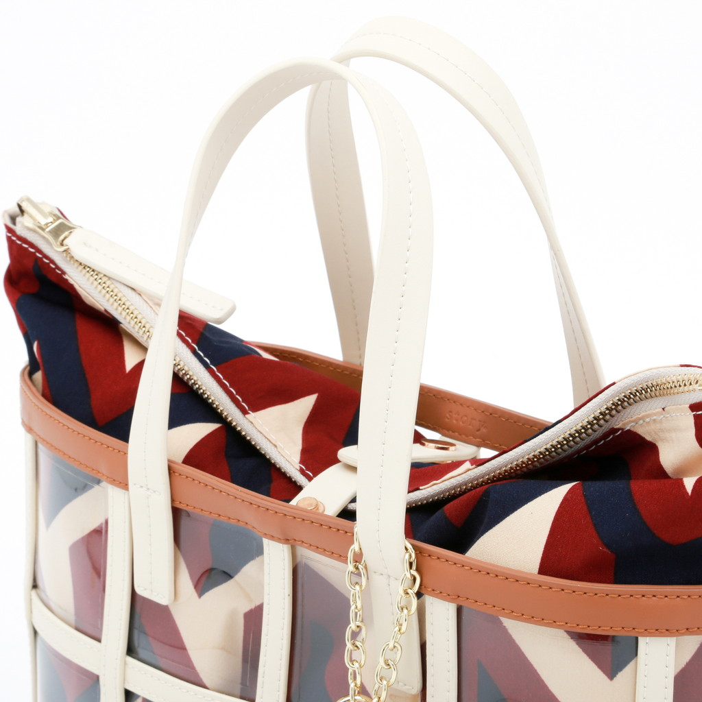 クリア素材にレザーテープを格子状に重ねたユニークなビニールバッグ。外側のチェックとインナーのレトロなジオメトリック柄とのパターンonパターンは、大胆ながらも上品でグラフィカルな仕上がり。インポーチは無地のプレーンなデザインとリバーシブル仕様になっているため、シーンや装いに合わせてセレクトすることが出来ます。