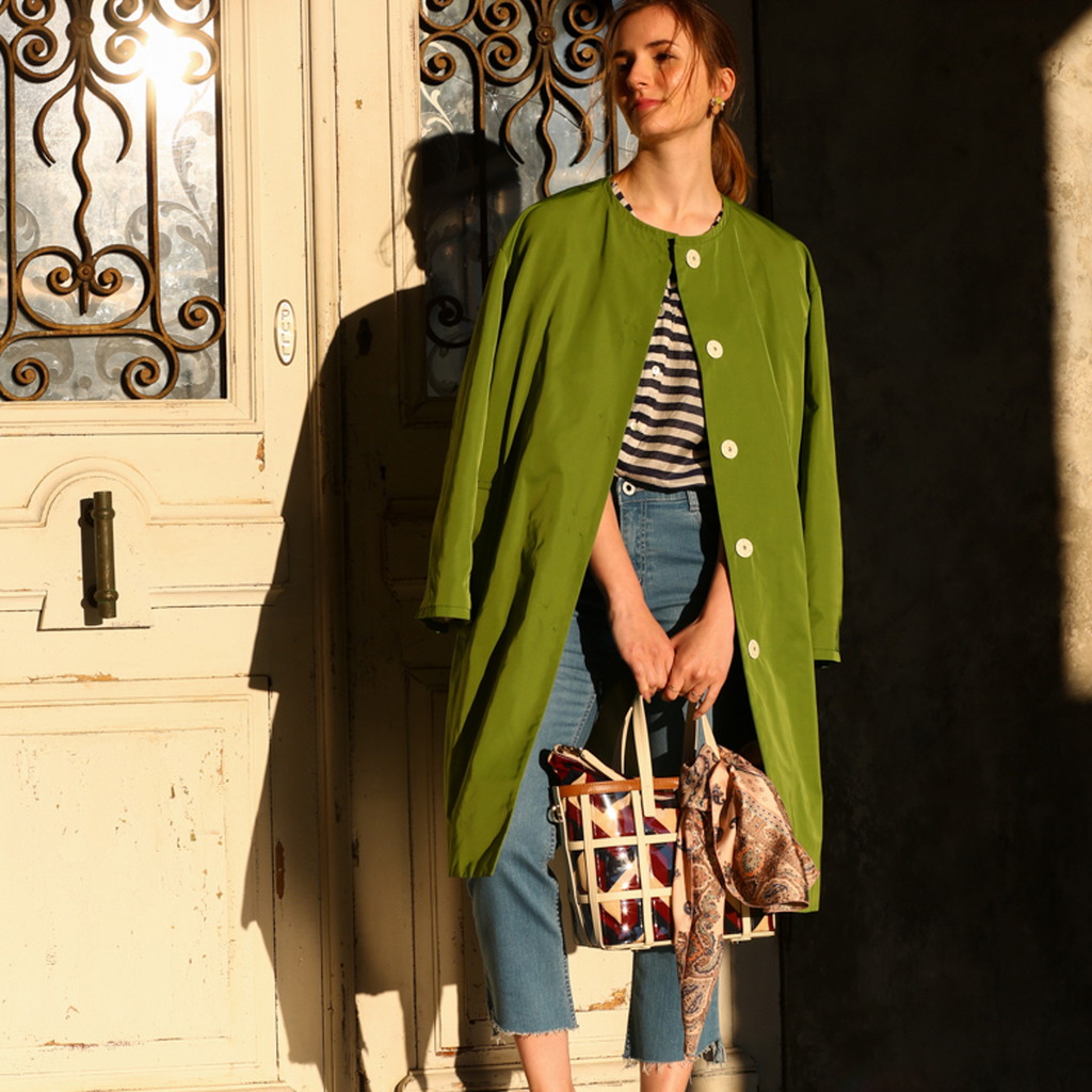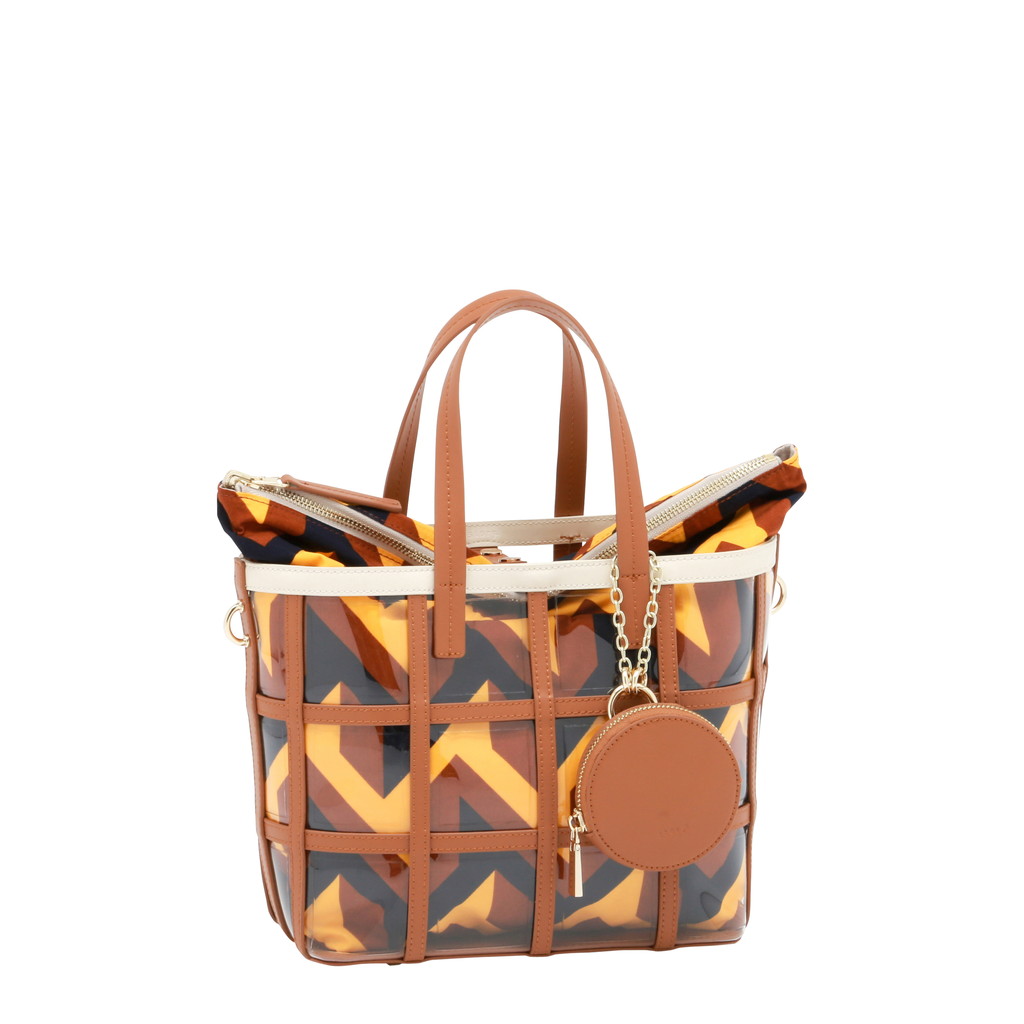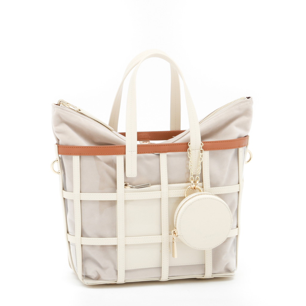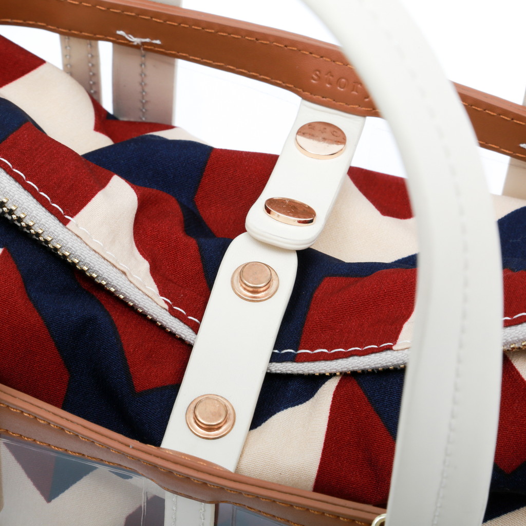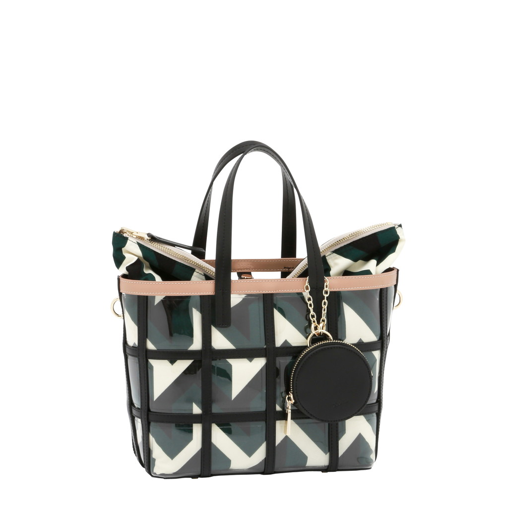 クリア素材にレザーテープを格子状に重ねたユニークなビニールバッグ。外側のチェックとインナーのレトロなジオメトリック柄とのパターンonパターンは、大胆ながらも上品でグラフィカルな仕上がり。インポーチは無地のプレーンなデザインとリバーシブル仕様になっているため、シーンや装いに合わせてセレクトすることが出来ます。
