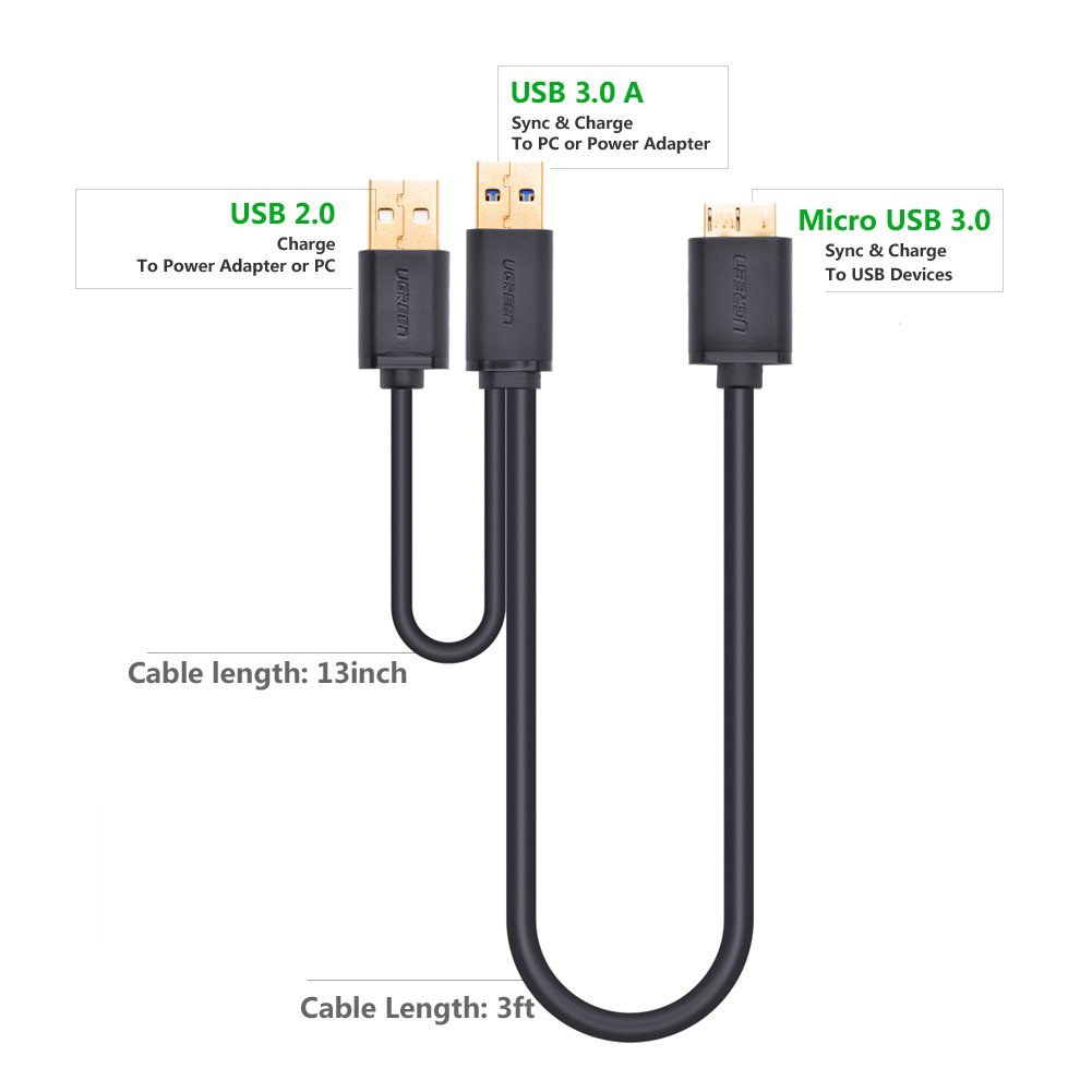 Ugreen Y letter Micro USB 3.0 cable 35 cm USB 2.0 power auxiliary cable installed