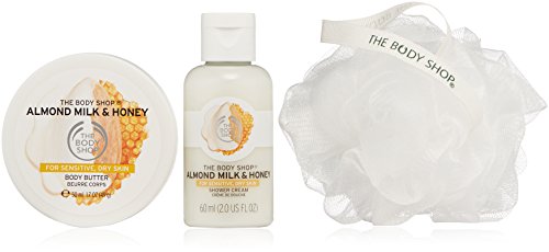 -. Feature : Bath and body gift set of travel size treats from The Body Shop's soothing and comforting Almond Milk and Honey range / Almond Milk and Honey Shower Cream 60ml: gently cleanses and refreshes skin without stripping skin of moisture / Almond Milk and Honey Body Butter 50ml: soothes, restores and protects dry, sensitive skin with moisture up to 48 hours / Bath Lily: ideal for use with the body wash to enhance lather / Made with almond milk from Spain and Community Trade honey from Ethiopia