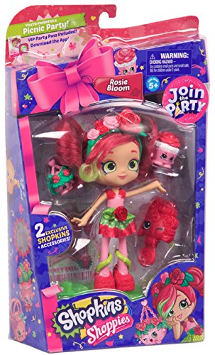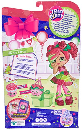 It's time to party in Shopville! It's the biggest party ever, and all Shopkins and Shoppies are invited! Each Shoppie is themed around a different type of party, dressed from head to toe in the most exciting outfits! Follow your nose to a sweet smelling rose! You are invited to the prettiest garden party in Shopville Everything about Rosie Bloom is blooming wonderful! She’s sweet, delicate and true romantic! Everyone loves to party! Come on! It’s time for some fun and games of the lawn! Rosie Bloom comes with their own brush, 2 exclusive Shopkins, a Party Dancefloor Twirl Stand, and a VIP Card that unlocks bonus content on the Welcome to Shopville App!Feature