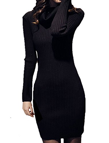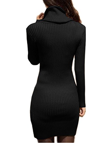 V28 Women Vintage Cowl Neck Stripe Kint Stretchable Elasticity Long Sleeve Slim Fit Sweater Dress XS/S US 2-8 Black