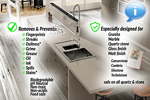 -. Feature : "Best Stone, Granite and Quartz Countertop Cleaner" - Voted 3 years running Stone Industry Professionals. / SUPERIOR RESULTS: Guaranteed to safely clean any Granite, Marble, Quartz Countertop or any hard surface without streaking. Returns the Shine, Polish while cleaning and sanitizing - everytime! / No more fingerprintings - NOW WITH BONUS nanoTECH cleaning cloth Cleans and Protects IN FACT, USE ON ALL SURFACES: Sparkling, residue-free results on kitchen countertops, bathrooms, high chairs, electronics, smartphones, tablets, hardwood floors, wheels, laminate, chrome, granite, glass, jewelry, metal, painted surfaces, plastic, porcelain, ovens, quartz, sealed & unsealed stone, sinks, stainless steel, toilets, tables, toys, vinyl, walls, and any other solid surface / REMOVES TOUGH STAINS with ease without the use of harsh chemicals or scrubbers. / ALL NATURAL INGREDIENTS - 100% Biodegradable, non-toxic, pH neutral & food safe. Will not harm, dull or damage any stone surface. Even safe enough to use on 2pak painted surfaces, your glass or tile back splashes will be streak free clean.