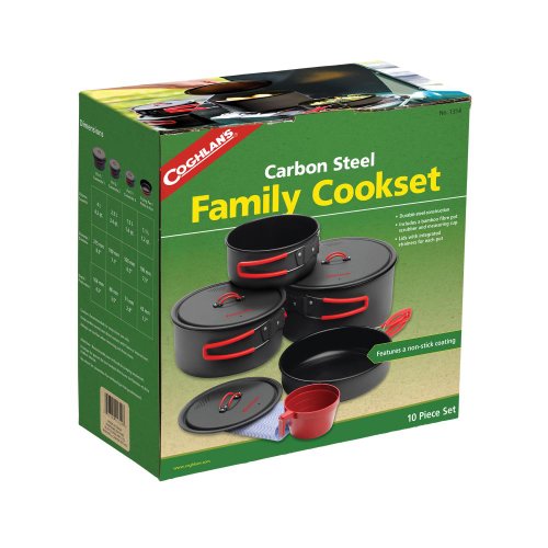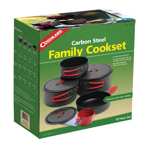 Studio : Coghlans Publisher : Coghlans Binding : Sports Product Description The Coghlans Carbon Steel Family Cook set is coated with non-stick coating on the inside. Heavy duty steel construction with swing-out handles on each pot and pan. Easily nests together for compact storage. Includes: 7.5" fry pan, 4 L liter pot with lid, 2.3 L pot with lid, 0.3 L pot with lid, bamboo fiber pot scrubber measuring cup and nylon carry bag. 0