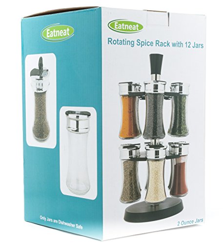 EatNeat Smooth Rotating Spice Rack with 12 Refillable Glass Jars and Multi-Option Chrome Shaker Lids