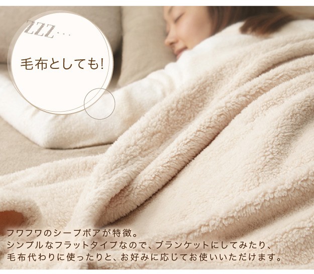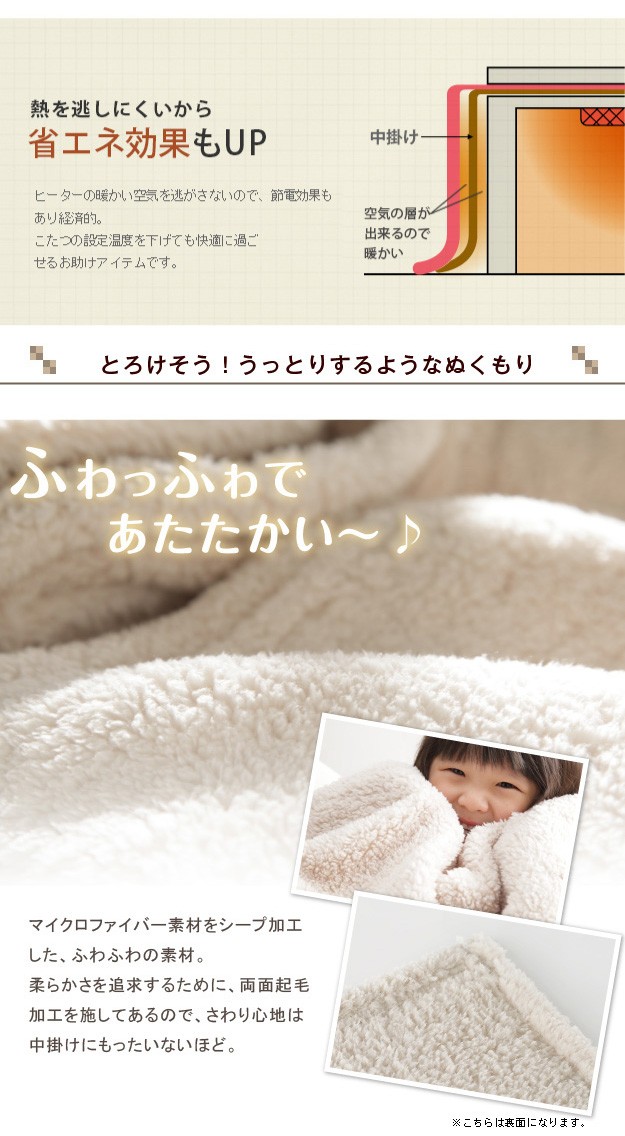 商品について:軽くて暖かいシープボア素材の中掛け毛布。肌触りの良いふわふわ質感を出すために両面起毛加工(裏表とも同じ質感です)。薄くてかさばらないのに暖かい。重ね掛けをすることでより暖かく快適に過ごせるお助けアイテム☆熱を逃がしにくいので省エネにも。丸洗いできるので、こたつ上掛けにも使えます。