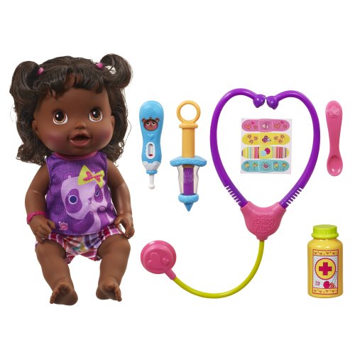 -. Binding : Toy -. Brand : Baby Alive -. Color : multi/none -. Department : Female -. EAN : 0653569864615 -. Feature : Comfort your Make Me Better Baby doll when she feels sick / Her cheeks glow when she feels bad and dim when she feels better / Give her a checkup with the pretend thermometer and stethoscope / Give her "medicine" when she tells you her tummy hurts / Doll speaks English and Spanish -. IsAdultProduct : 0 -. ItemPartNumber : A4878U000 -. Label : Hasbro -. LegalDisclaimer : Ages 3+. Small parts -. Manufacturer : Hasbro -. Model : A4878U00 -. MPN : A4878U000 -. PackageQuantity : 1 -. PartNumber : A4878U000 -. ProductGroup : Toy -. ProductTypeName : TOYS_AND_GAMES -. Publisher : Hasbro -. Size : ONE SIZE -. Studio : Hasbro -. Title : Baby Alive Make Me Better Baby Doll -. UPC : 653569864615 -. Warranty : No Warranty