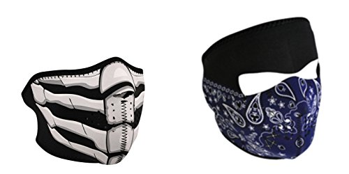 -. Feature : This Product is a 'Bundle' of 2 Neoprene Face Masks identified as a 'Bones Breath' and a 'Blue Paisley Bandanna' / The First Facemask is the ZanHeadgear 'Bones Breath', Glow in the Dark, Half Face Neoprene Face Mask / The Second Facemask is the ZanHeadgear 'Blue Paisley Bandanna' Full Face Neoprene Face Masks / These Face Masks / Ski Mask are made of Durable, Naturally Warm & Water Resistant Neoprene Face Mask Material / The Mask Sizes are adjustable, by up to 2 inches, using the Hook & Loop closure, located at the back of the head