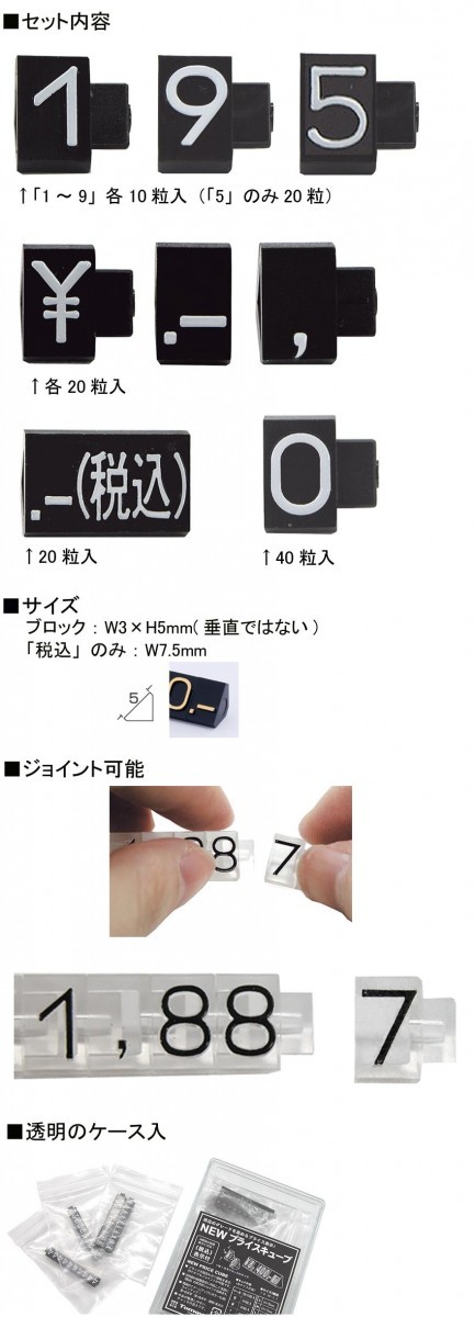 | 高級感やブランドイメージを演出する際のアクセントに最適です。税込表示チップ入で、総額表示対応です。文字チップを組み合わせて何ケタでもジョイントが可能です。 |