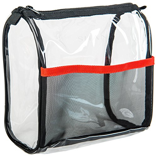Made with non-toxic water-resistant plastic, timelessly decorated with matte black trim, mesh external compartment, and durable zipper