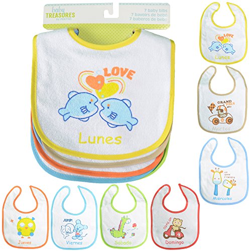 -. Binding : Apparel -. Brand : PEKITAS -. Color : One Pack of 7 Pieces Bibs, White Background -. Department : unisex-baby -. EAN : 8433699110019 -. Feature : IMPORTANT: It consists of two layers, the first layer of thick cotton and the second layer of waterproof polyester layer. / Made of soft adjustable closure, it will not scratch / One pack of 7 bibs, one for each day of the week. / One bib size: 11 inches long * 8.3 inches width / Neck diameter size: 3.3 inches, variable by closure -. IsAdultProduct : 0 -. Model : baberos001-7 -. MPN : baberos001-7 -. PartNumber : baberos001-7 -. ProductGroup : Apparel -. ProductTypeName : ACCESSORY -. Size : 11 X 8.3 inches -. Title : PEKITAS 7 Pack Baby Waterproof Bibs Soft Adjustable Closure Cotton Front-side Unisex Size 11 inches X 8.3 inches