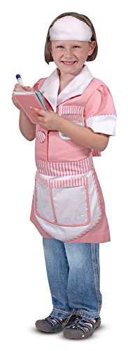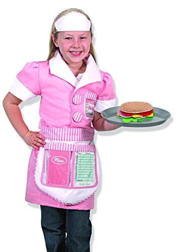 This adorable waitress costume is "made to order" for restaurant play! The pretty pink dress comes with a cap and ready-to-personalize name tag, plus a color-coordinated apron with pockets that conveniently store the included menu and dry-erase order ticket. A sturdy tray completes this professional look, and is ready to "serve up" years of imaginative food service fun!Feature