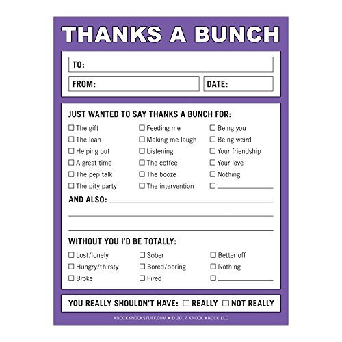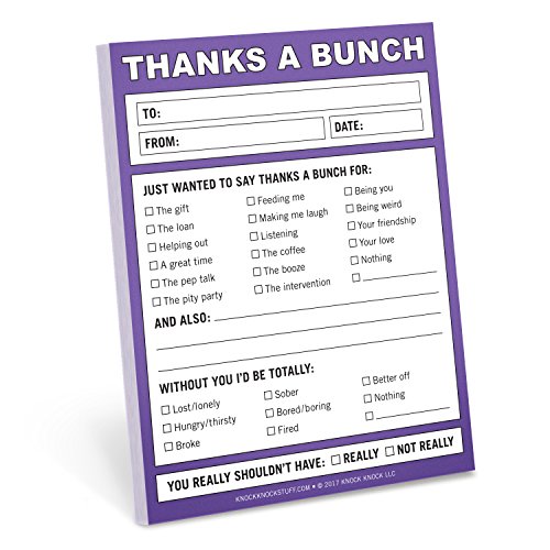 Studio : Knock Knock (Office Products) Publisher : Knock Knock (Office Products) Binding : Office Product Product Description They say that gratitude is the key to happiness. This notepad makes it easy to spread thank you notes far and wide-to coworkers, friends, dates, bus drivers, and total strangers. Be warned: regular use may cause a surge in your good vibes, not to mention your popularity. Don't be a hater, be an appreciator with cool stationery. Impress your work wife (or work husband) with fun office gifts! 4 x 5.25 inches, 50 sheets. Knock Knock is an independent maker of clever gifts, books, and whatever else they can think up. Their mission is to bring humor, creativity, and smarts to everyday life. Knock Knock’s crackerjack in-house team creates products and develops books from the ground up-as well as collaborating with outside authors, bloggers, and other creative types. Whether producing sticky notes or a volume of thoroughly researched nonfiction, Knock Knock happily dispenses irreverence, wordplay, and wit from its sunny perch in Venice, California, to folks around the globe. Say something more with #knockknockstuff. 0