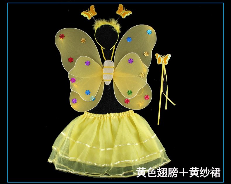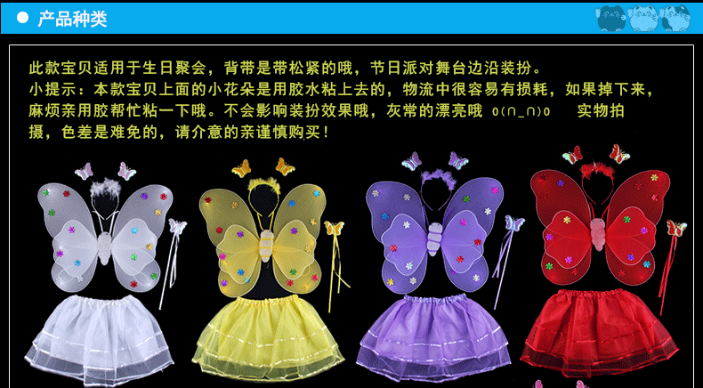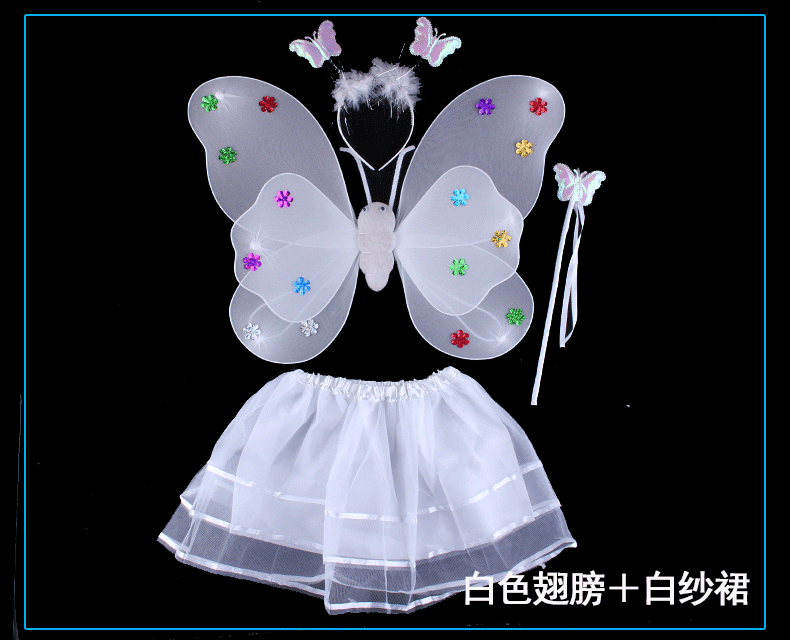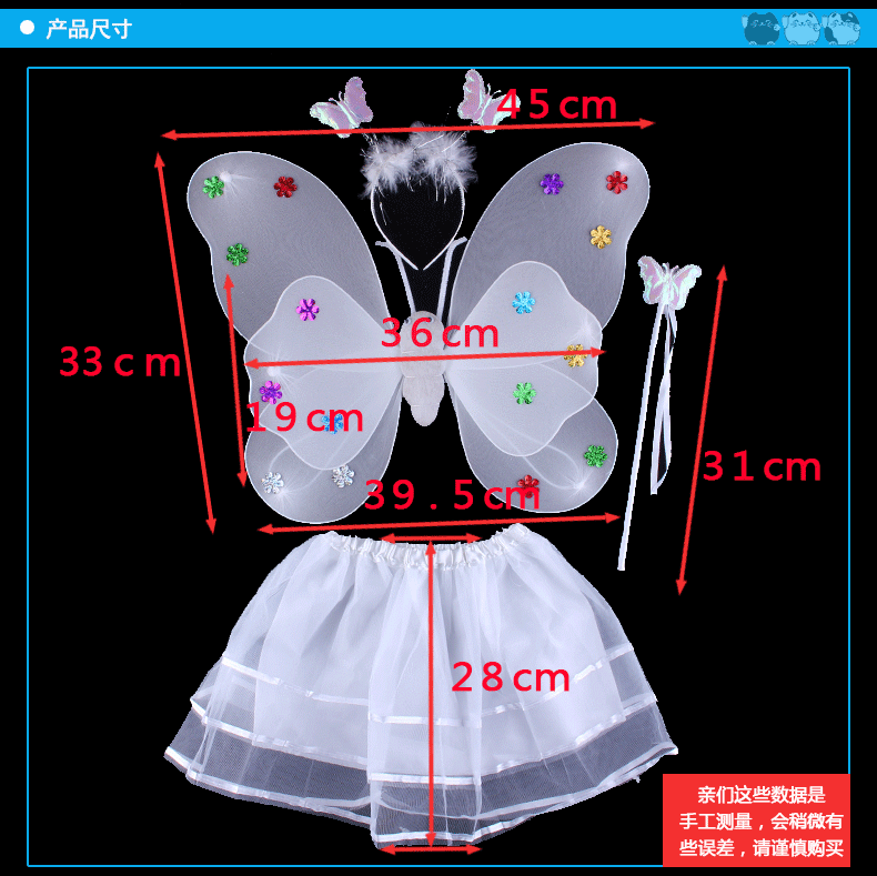 [commodity size] wings 33*45cm [material]: gauze + wire The contents include one wing, one head, a fairy, and a yarn. For a birthday party, strap is elasticized oh. Holiday party stage dress. Real shot, the network is inevitable color difference! Note: this section of the wings do not have gold powder. Without yarn skirt is 2 sets of price, with a yarn dress is a set of prices