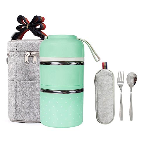 Stainless Steel Interior Bento Lunch Box 2-Tier Insulated Leak-Proof Tiffin Food Container Storage Carrier With Insulated Bag And Cutlery(Green)Great Gift for Valentine's Day