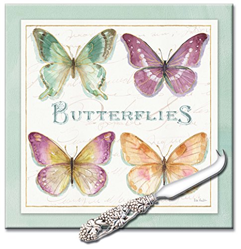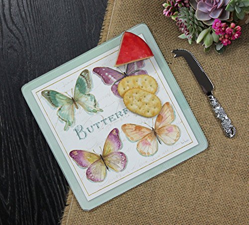 CounterArt 'Rainbow Butterflies' 8-Inch Square Glass Cheese Board with Cheese Knife