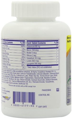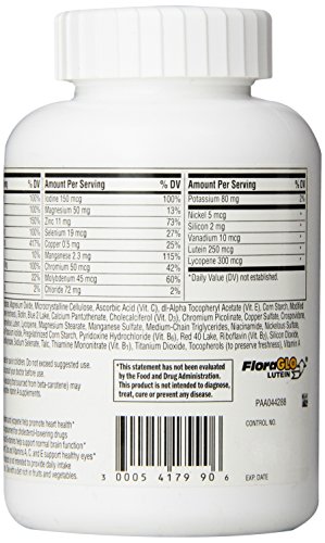 Calcium carbonate, potassium chloride, dibasic calcium phosphate, magnesium oxide, microcrystalline cellulose, ascorbic acid (vit. C), dl-alpha tocopheryl acetate (vit. E), corn starch, pregelatinized corn starch, modified corn starch, contains less than 2% of: beta-carotene, bht (to retard oxidation), biotin, blue 2 lake, calcium pantothenate, cholecalciferol (vit. D3), chromium picolinate, crospovidone, cupric sulfate, cyanocobalamin (vit. B12), folic acid, gelatin, hydrogenated palm oil, lutein, lycopene, magnesium borate, magnesium stearate, maltodextrin, manganese sulfate, niacinamide, nickelous sulfate, phytonadione (vit. K), polyethylene glycol, polyvinyl alcohol, potassium iodide, pyridoxine hydrochloride (vit. B6), red 40 lake, riboflavin (vit. B2), silicon dioxide, sodium ascorbate (to retard oxidation), sodium borate, sodium metavanadate, sodium molybdate, sodium selenate, talc, thiamine mononitrate (vit. B1), titanium dioxide, tocopherols (to retard oxidation), vitamin a acetate, yellow 6 lake, zinc oxide.