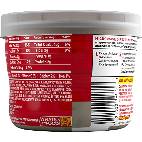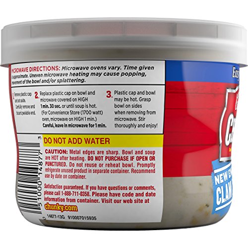 Enjoy the classic East Coast taste no matter where you go with Campbell’s Chunky New England Clam Chowder in a microwavable bowl. Dig into our rendition that has it all: hearty potatoes and big pieces of succulent clams in a rich, fill-you-up chowder. It's so satisfying that you won't believe it. Soup that eats like meal—straight from its portable bowl.Feature