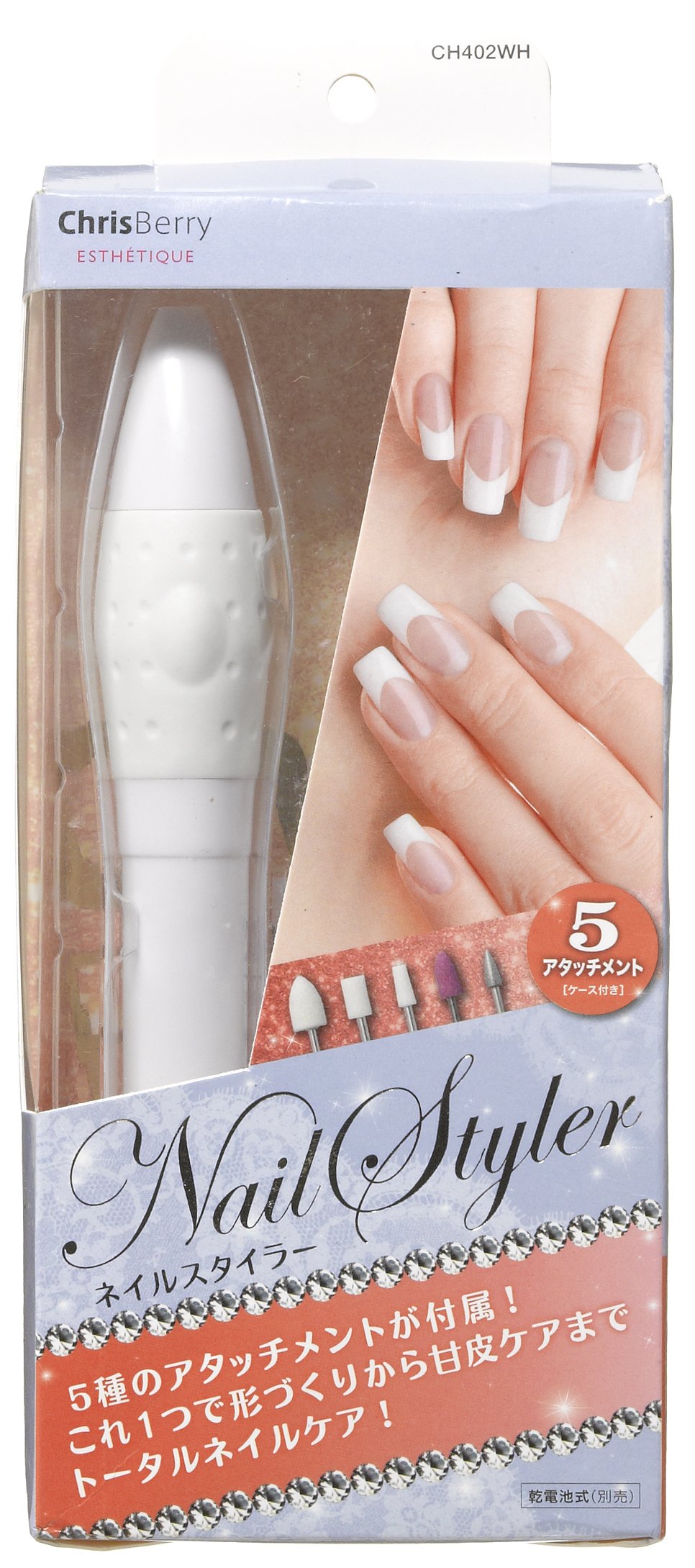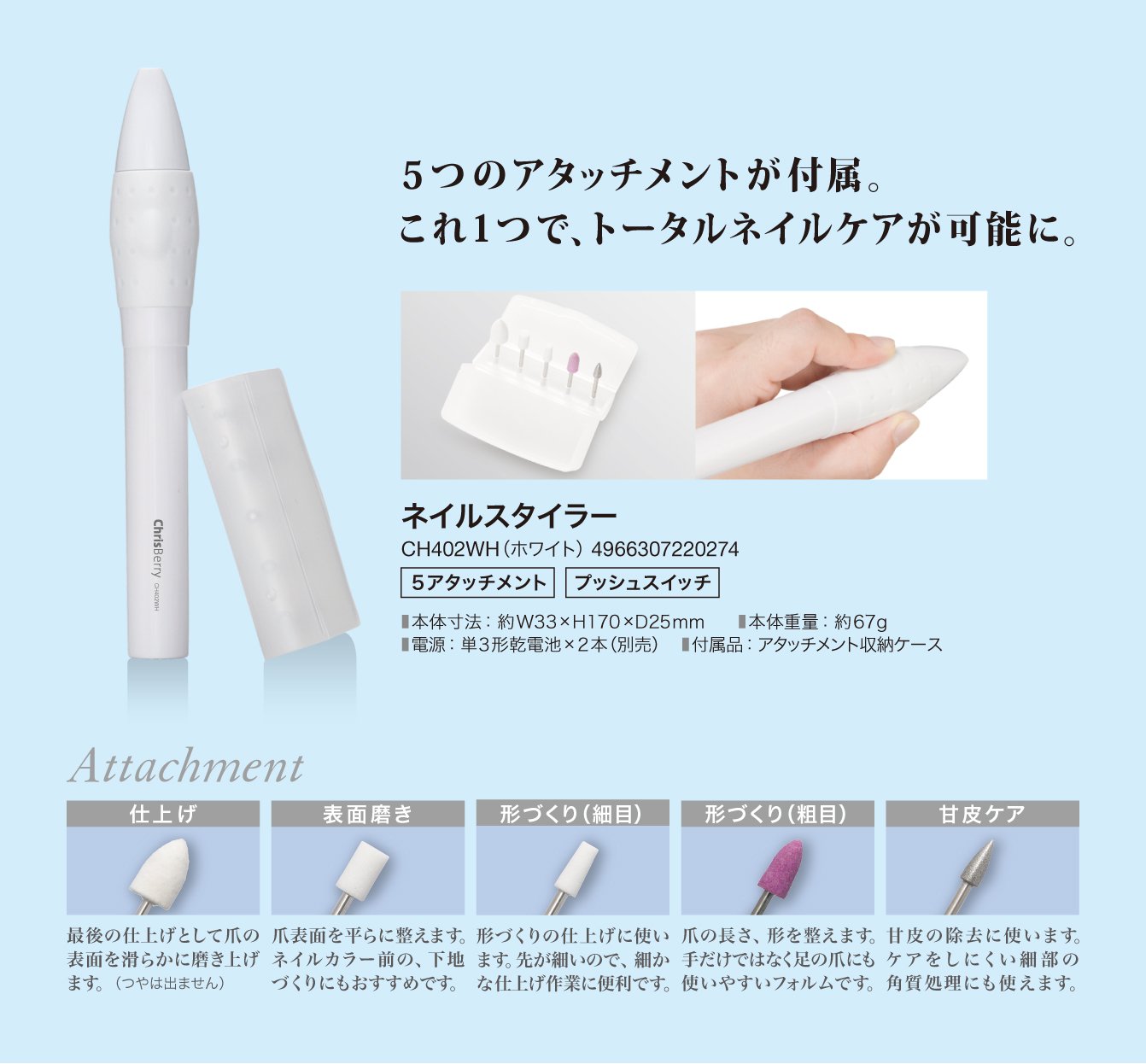 ● Total nail care with 5 types of attachment ● Push switch type prevents excessive overhanging of nails · horny material ● Attachment is convenient for storage with case ● Package form: paper box ● Batteries used: AA