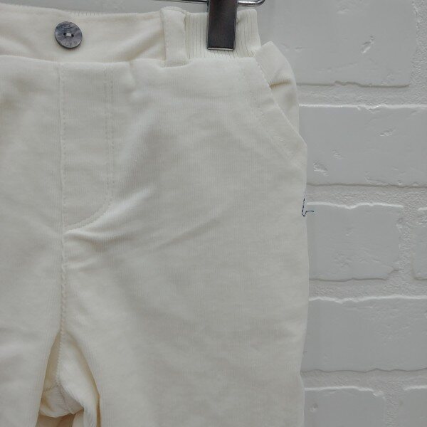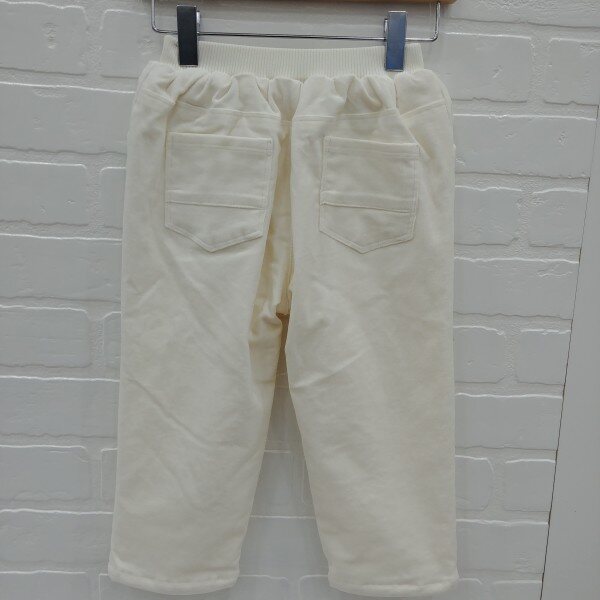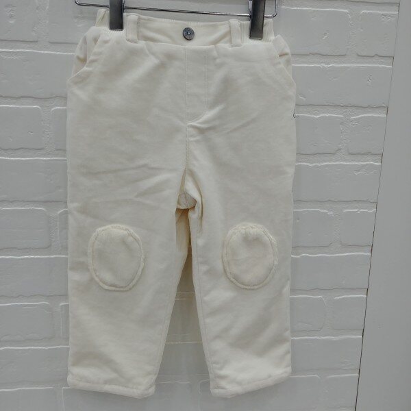 코듀로이 스판 소재를 사용한 배기팬츠, 부드러운 안감을 사용하여 보온성을 높여준 스타일. 퍼배색 무릎패치와 런링스티치 자수로 포인트를 준 스타일.