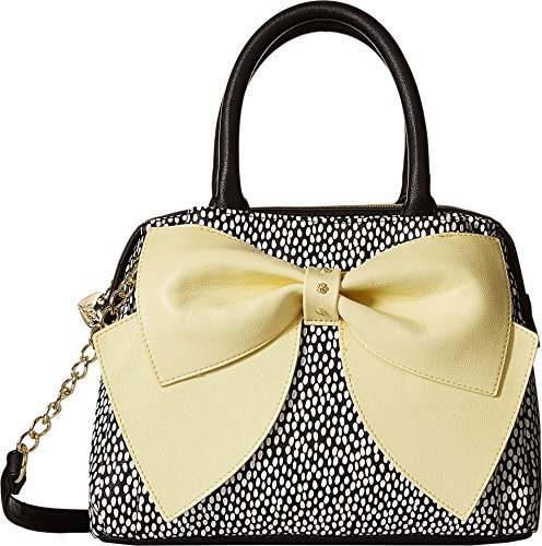 Top zip closure. Dual rolled carry handles. Removable crossbody strap with chain detail. Exterior features large bow detail at front, and slip pocket at front and back. Flat base. Lined interior flaunts a back wall zip pocket and two slip pockets. Imported.