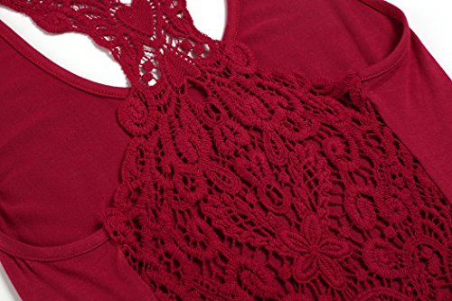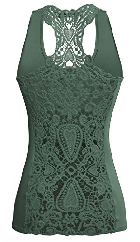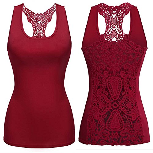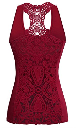 -. Feature : 95% Rayon and 5% Spandex / 6 Colors for your choice: Wine Red, Purple, Green, Black, Blue, Army Green / Design: Racerback Tank, Crochet Lace Back / O-neck hollow crochet lace racerback tank tops, solid pattern and stretch. / Soft and comfortable material, slim fit, suitable for Casual, Sport, Eexercise, Clubwear