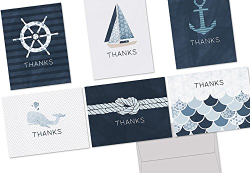 72 Note Cards - Nautical Thank You - 6 Designs - Blank Cards - Gray Envelopes Included