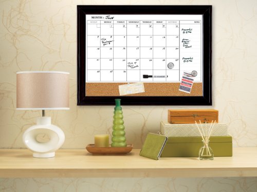 - Dry-erase, 5-week undated monthly calendar; magnetic surface hangs items without push pins; natural cork surface for additional posting capability