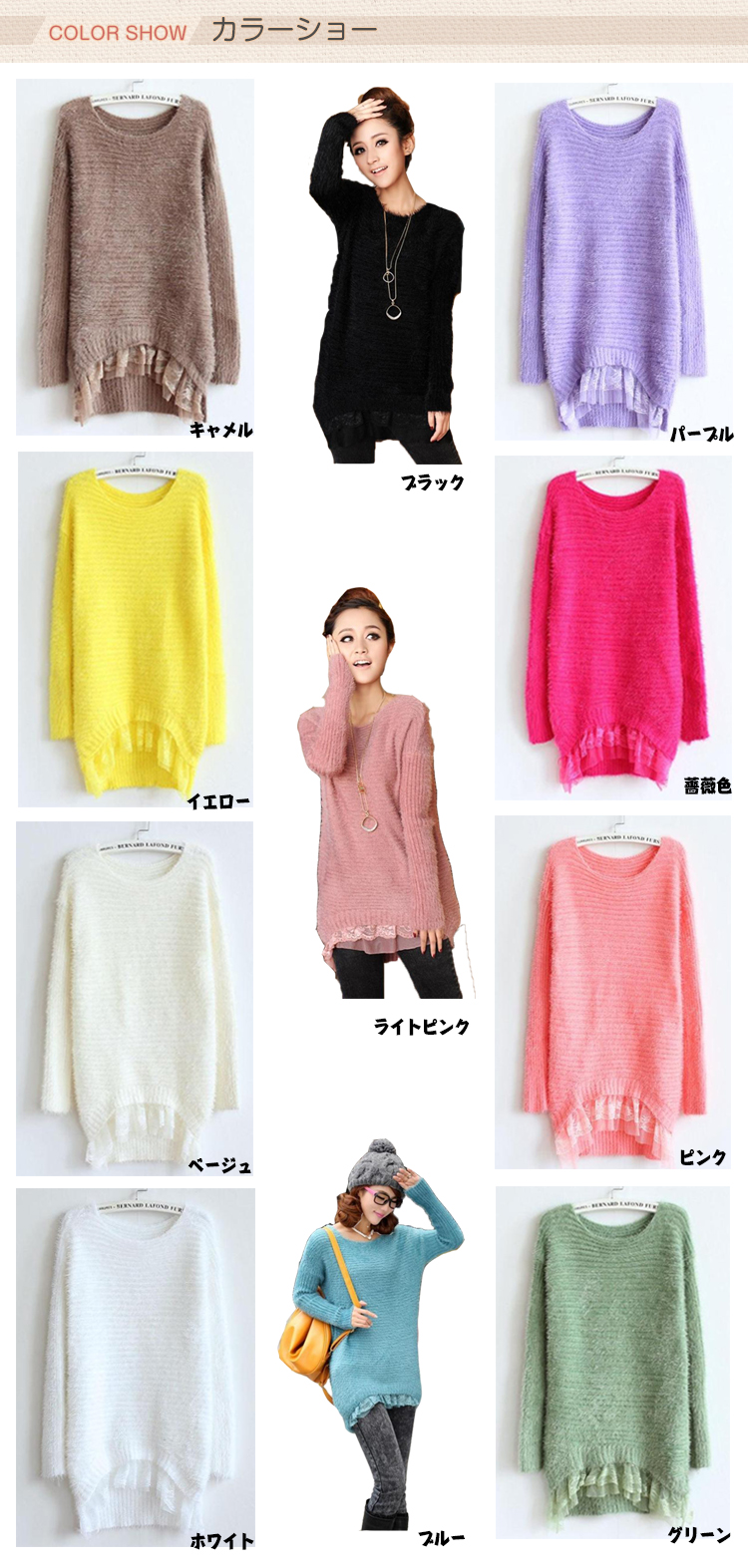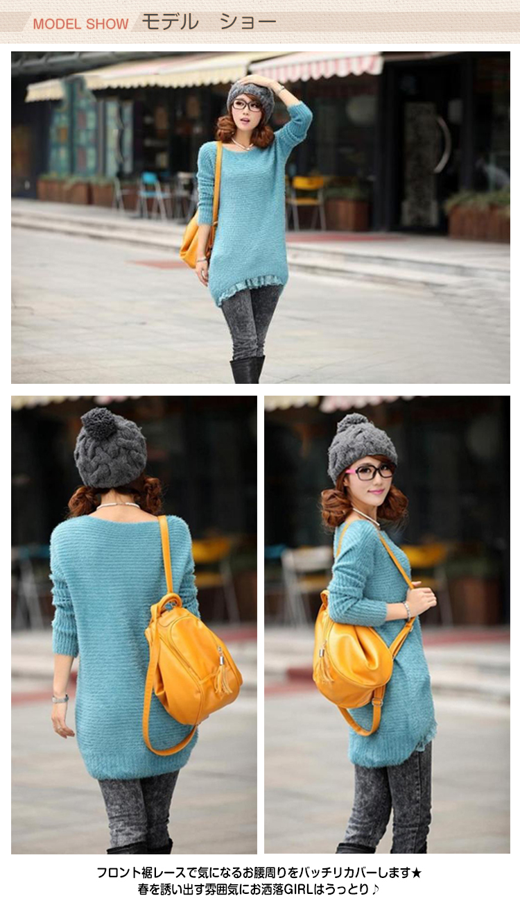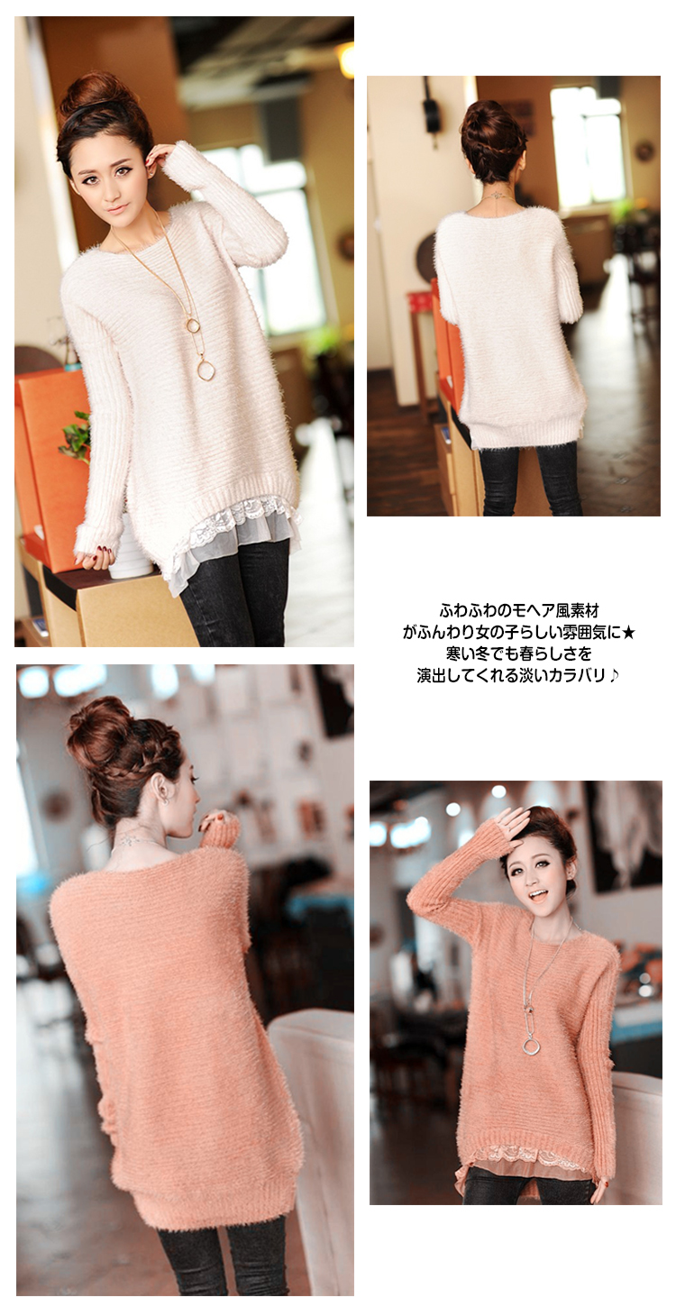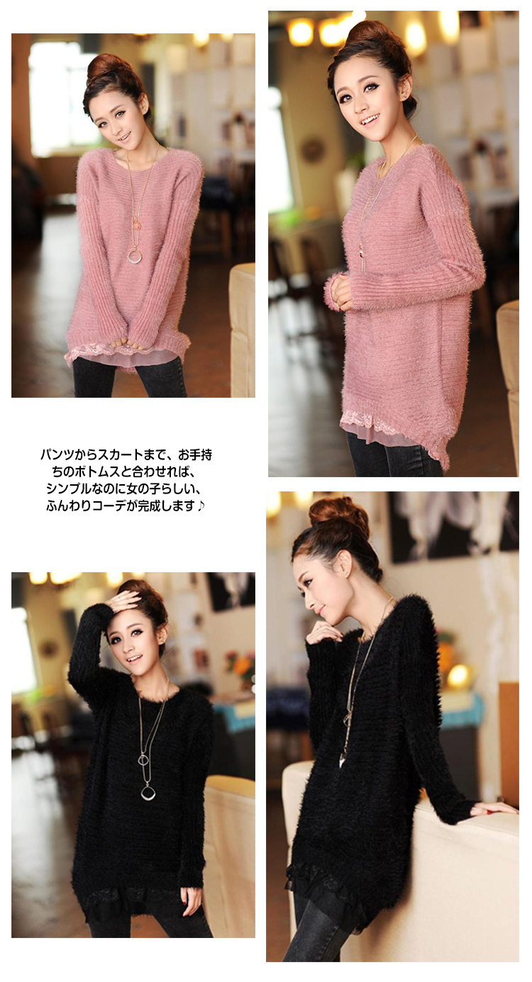 | ガーリー気分で春支度?トレンドのレイヤード風モヘアニットの登場!フロント裾レースで気になるお腰周りをバッチリカバーします★春を誘い出す雰囲気にお洒落GIRLはうっとり?ふわふわのモヘア風素材がふんわり女の子らしい雰囲気に★寒い冬でも春らしさを演出してくれる淡いカラバリ?パンツからスカートまで、お手持ちのボトムスと合わせれば、シンプルなのに女の子らしい、ふんわりコーデが完成します? | |