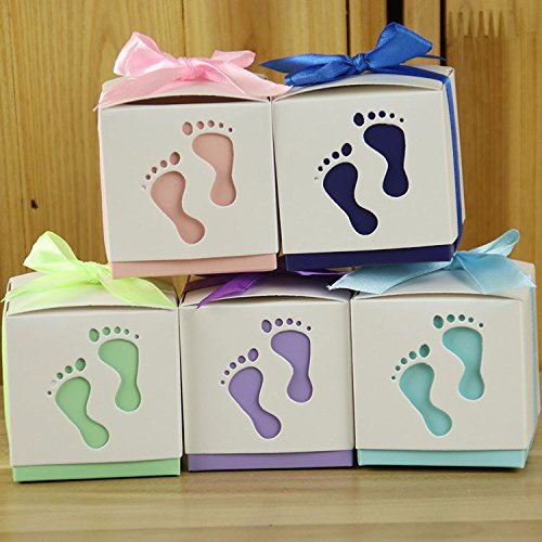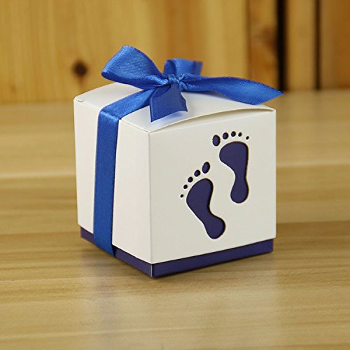 Fascola Pack of 50 Fashion Baby Foot Candy Box Baby Shower Paper Sweet Bag Footprints On The Beach Favour Boxes Baptism Candy Container (Royal Blue)