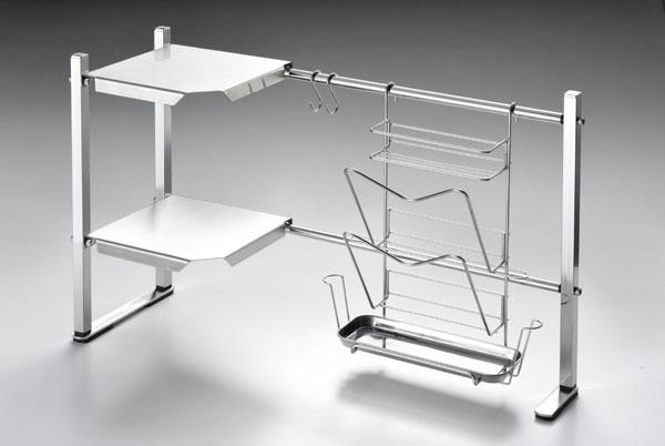 | 調理中、置き場に困るキッチン用品をまとめて収納できる便利なラックです!コーナー棚とワイヤー収納は左右どちらでも取り付け可能! |