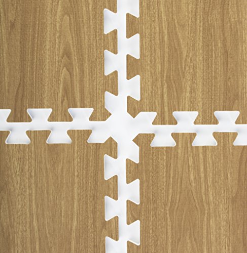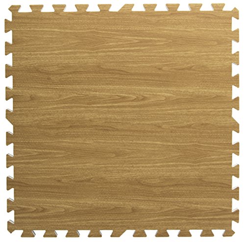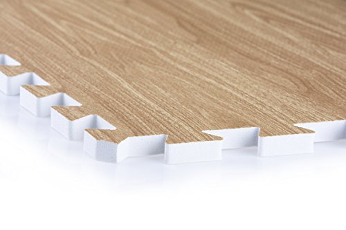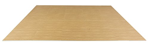 This light oak interlocking wood floor mat comes with 13 soft foam tiles. Each 1/2" thick puzzle piece links together with other pieces to create a 6' x 8' rectangle. Buy 2 sets or 26 pieces to create a 10' x 10' square. Use this anti-fatigue flooring in a day care, playroom, yoga studio, gym, or tradeshow. Dimensions Per Piece: 24"w x 24"d x.5"h.