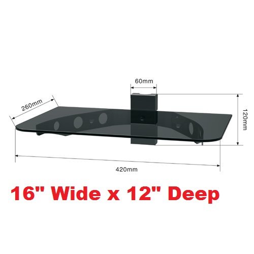 -. Feature : Tempered glass shelf with metal wall plate, concealed bolts and integrated cable management / Holds DVD player, VCR, cable box, satellite, Blu-Ray, PS3, XBOX,etc., with support for up to 22 lbs. / Includes complete hardware kit for installation; single-stud mounting / Dimensions: 16.0 x 4.7 x 12 inches (400 x 120 x 300 mm) (W x H x D) / Solid Steel structure with black glass