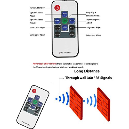 - Upgraded RF wireless remote help you create the fantasy light effect more freely! 20kinds of stable colors, 18kinds of color changing models, 6levels dimmable function, 6levels speed. No need to aim at the receiver, even penetrate walls and doors, no conflict with TV remote controller